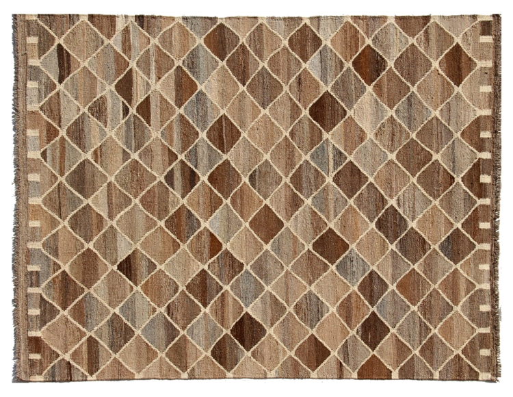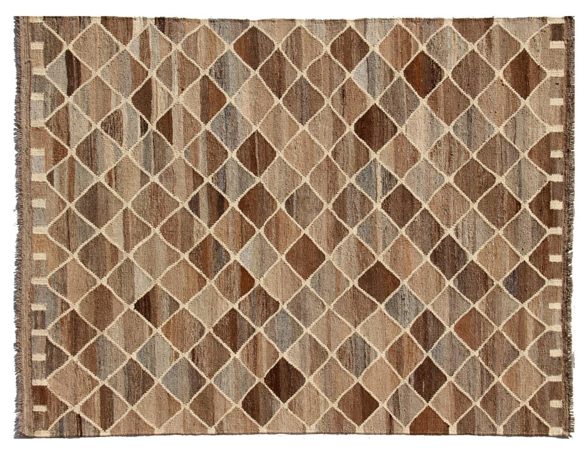 Estas alfombras kilim muestran una diferencia decisiva con las alfombras anudadas a mano - son tejidas a mano. Por lo tanto, no tienen un montón alto de lana y son a menudo más planos y más ásperos que las alfombras de lana anudada. Su fabricación es menos elaborada y por eso suelen ser mucho más baratas. Como ventaja, las alfombras de kilim son también mucho más ligeras y pueden ser colocadas por delante y por detrás. Los kilims tejidos a mano provienen originalmente de la antigua Persia y ahora también se fabrican a menudo en el Afganistán. Tienen patrones bastante simples y directos, que se deben a su técnica de tejido.