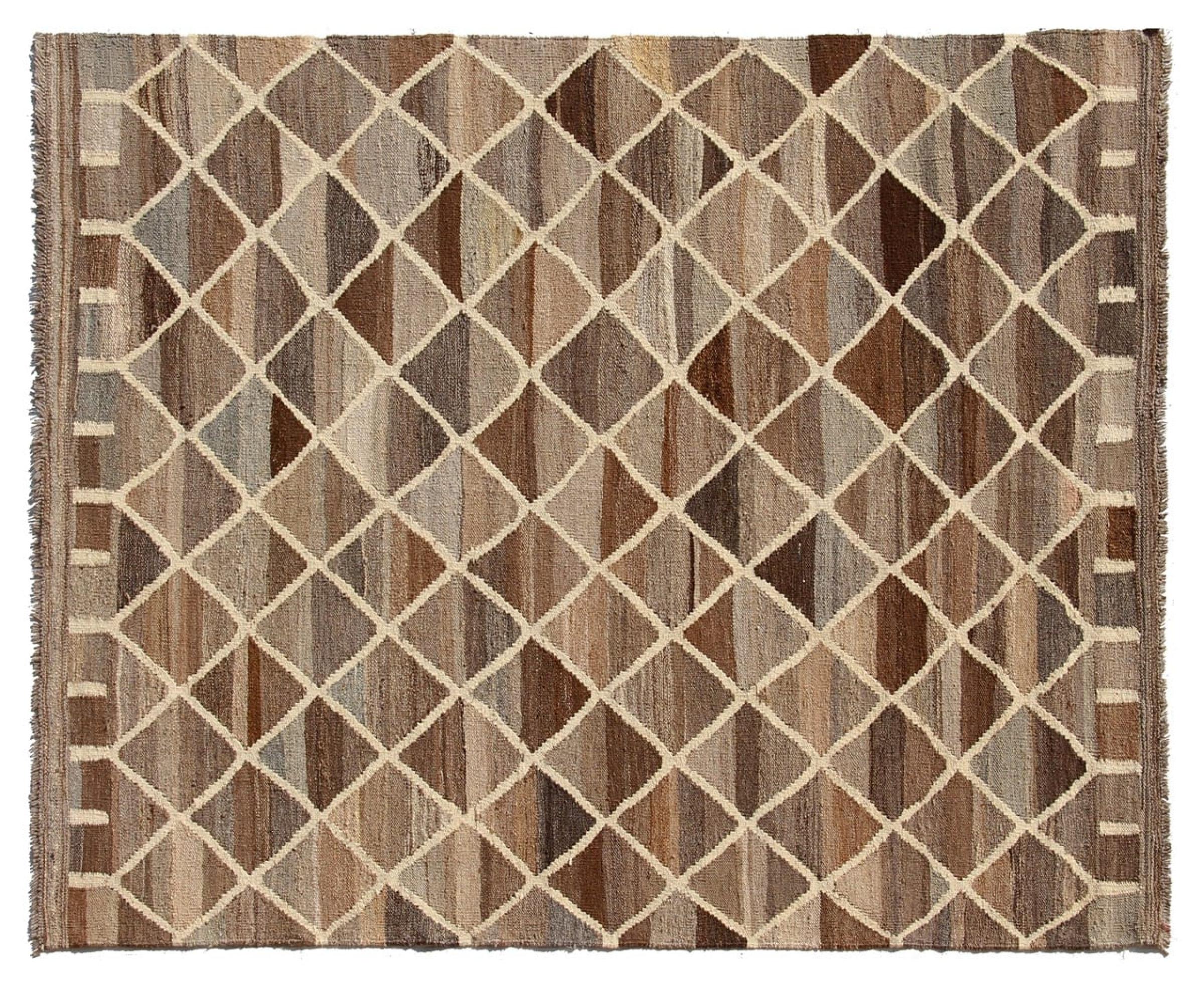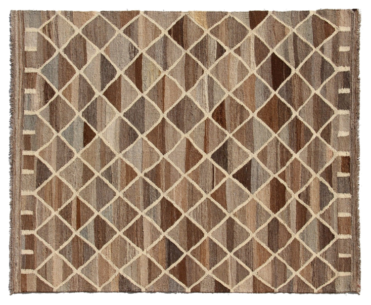 Estas alfombras kilim muestran una diferencia decisiva con las alfombras anudadas a mano - son tejidas a mano. Por lo tanto, no tienen un montón alto de lana y son a menudo más planos y más ásperos que las alfombras de lana anudada. Su fabricación es menos elaborada y por eso suelen ser mucho más baratas. Como ventaja, las alfombras de kilim son también mucho más ligeras y pueden ser colocadas por delante y por detrás. Los kilims tejidos a mano provienen originalmente de la antigua Persia y ahora también se fabrican a menudo en el Afganistán. Tienen patrones bastante simples y directos, que se deben a su técnica de tejido.