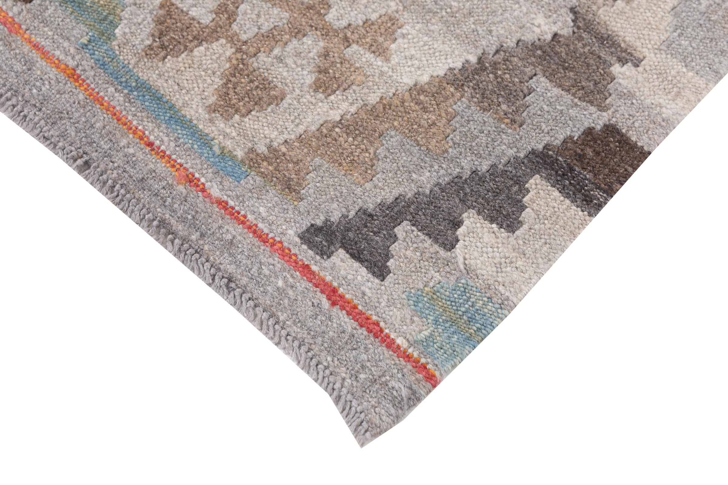 Esta alfombra fue hecha a mano en un telar como un tejido plano. Tejido plano es el término utilizado para describir las alfombras que no tienen pelo. Como el nombre promete, estas alfombras están tejidas y no anudadas. Esto resulta en una alfombra plana con una superficie estructurada. Los tejidos planos no son tan suaves y normalmente más delgados que las alfombras anudadas. Al mismo tiempo, su fabricación es mucho menos compleja y por lo general se pueden disponer por ambos lados (frontal y posterior). Sus patrones suelen ser geométricos, lo cual está determinado por el tejido.