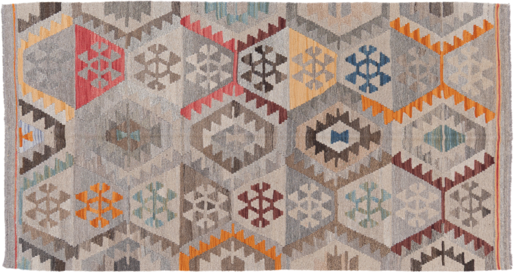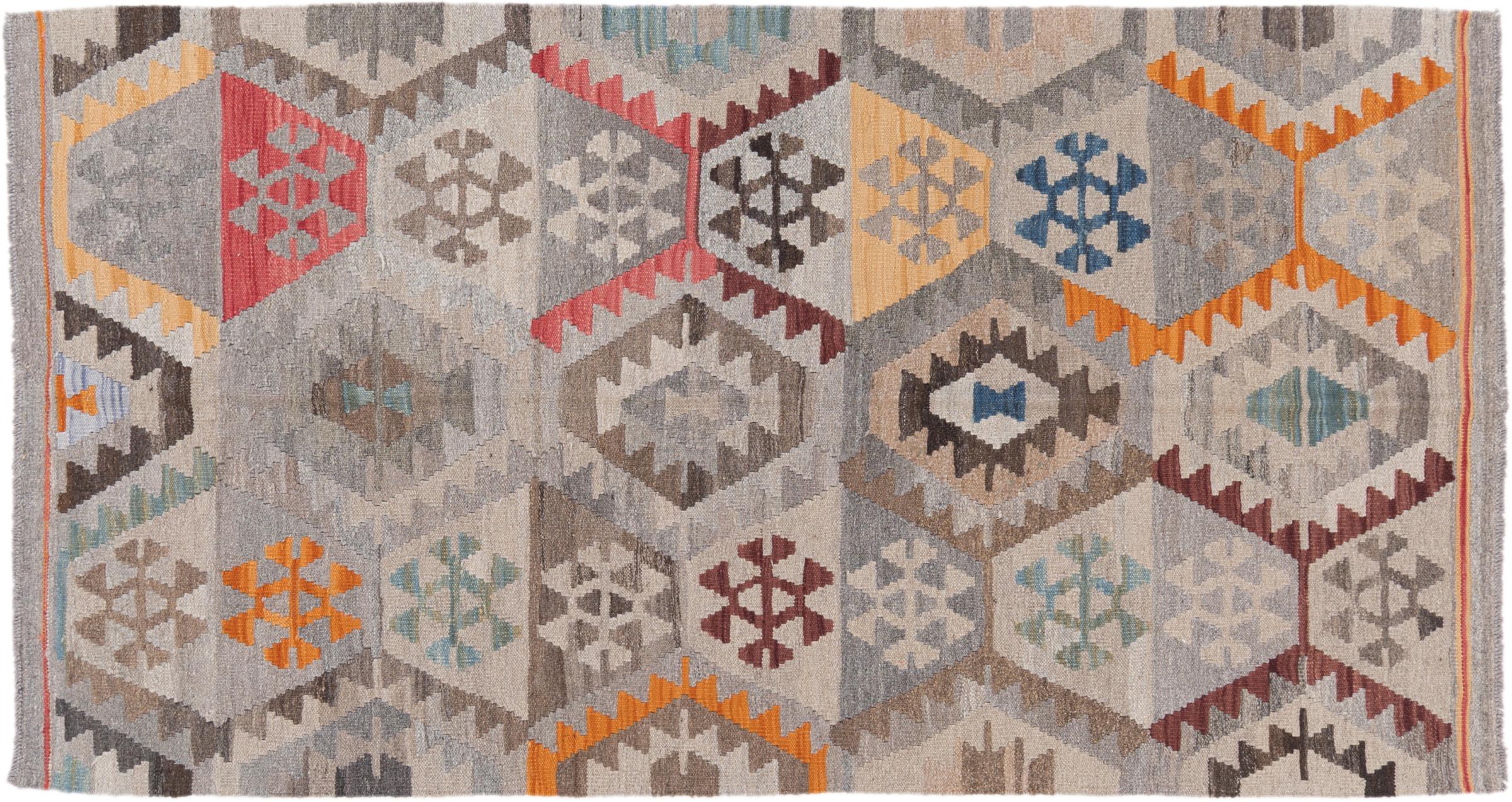 Estas alfombras kilim muestran una diferencia decisiva con las alfombras anudadas a mano - son tejidas a mano. Por lo tanto, no tienen un montón alto de lana y son a menudo más planos y más ásperos que las alfombras de lana anudada. Su fabricación es menos elaborada y por eso suelen ser mucho más baratas. Como ventaja, las alfombras de kilim son también mucho más ligeras y pueden ser colocadas por delante y por detrás. Los kilims tejidos a mano provienen originalmente de la antigua Persia y ahora también se fabrican a menudo en el Afganistán. Tienen patrones bastante simples y directos, que se deben a su técnica de tejido.