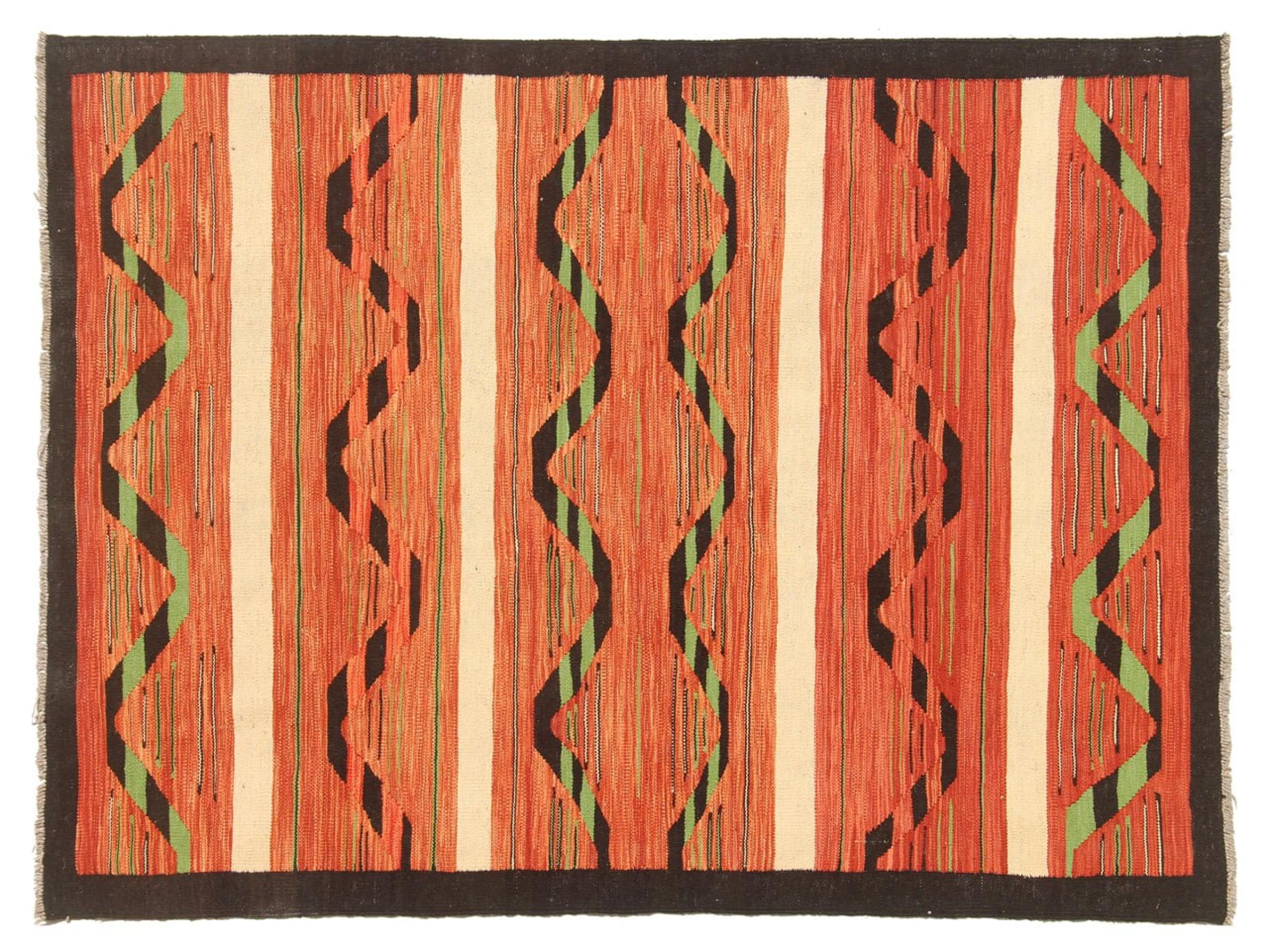 Esta alfombra fue hecha a mano en un telar como un tejido plano. Tejido plano es el término utilizado para describir las alfombras que no tienen pelo. Como el nombre promete, estas alfombras están tejidas y no anudadas. Esto resulta en una alfombra plana con una superficie estructurada. Los tejidos planos no son tan suaves y normalmente más delgados que las alfombras anudadas. Al mismo tiempo, su fabricación es mucho menos compleja y por lo general se pueden disponer por ambos lados (frontal y posterior). Sus patrones suelen ser geométricos, lo cual está determinado por el tejido.