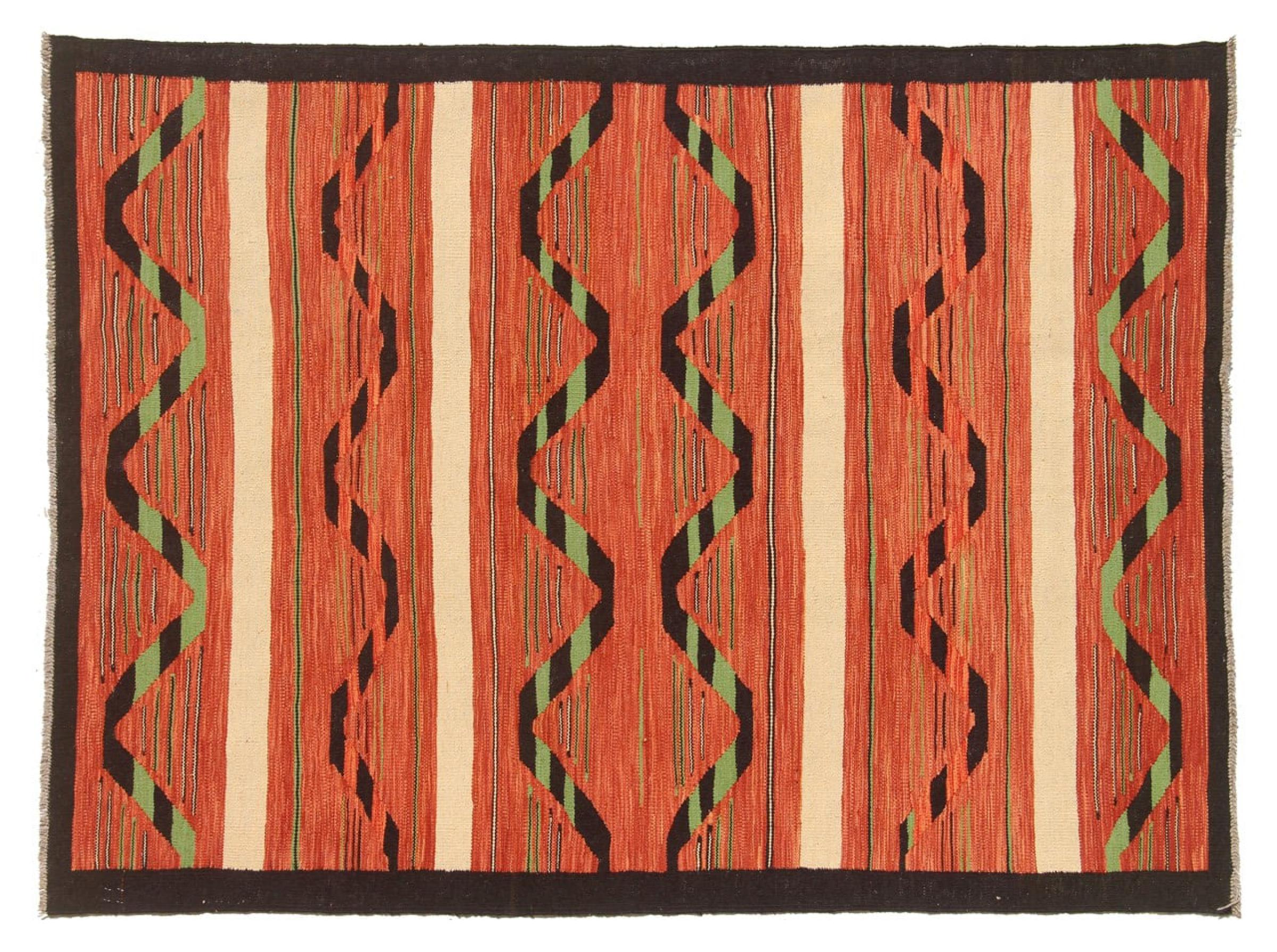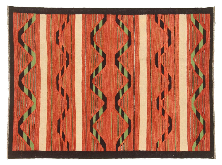 Esta alfombra fue hecha a mano en un telar como un tejido plano. Tejido plano es el término utilizado para describir las alfombras que no tienen pelo. Como el nombre promete, estas alfombras están tejidas y no anudadas. Esto resulta en una alfombra plana con una superficie estructurada. Los tejidos planos no son tan suaves y normalmente más delgados que las alfombras anudadas. Al mismo tiempo, su fabricación es mucho menos compleja y por lo general se pueden disponer por ambos lados (frontal y posterior). Sus patrones suelen ser geométricos, lo cual está determinado por el tejido.