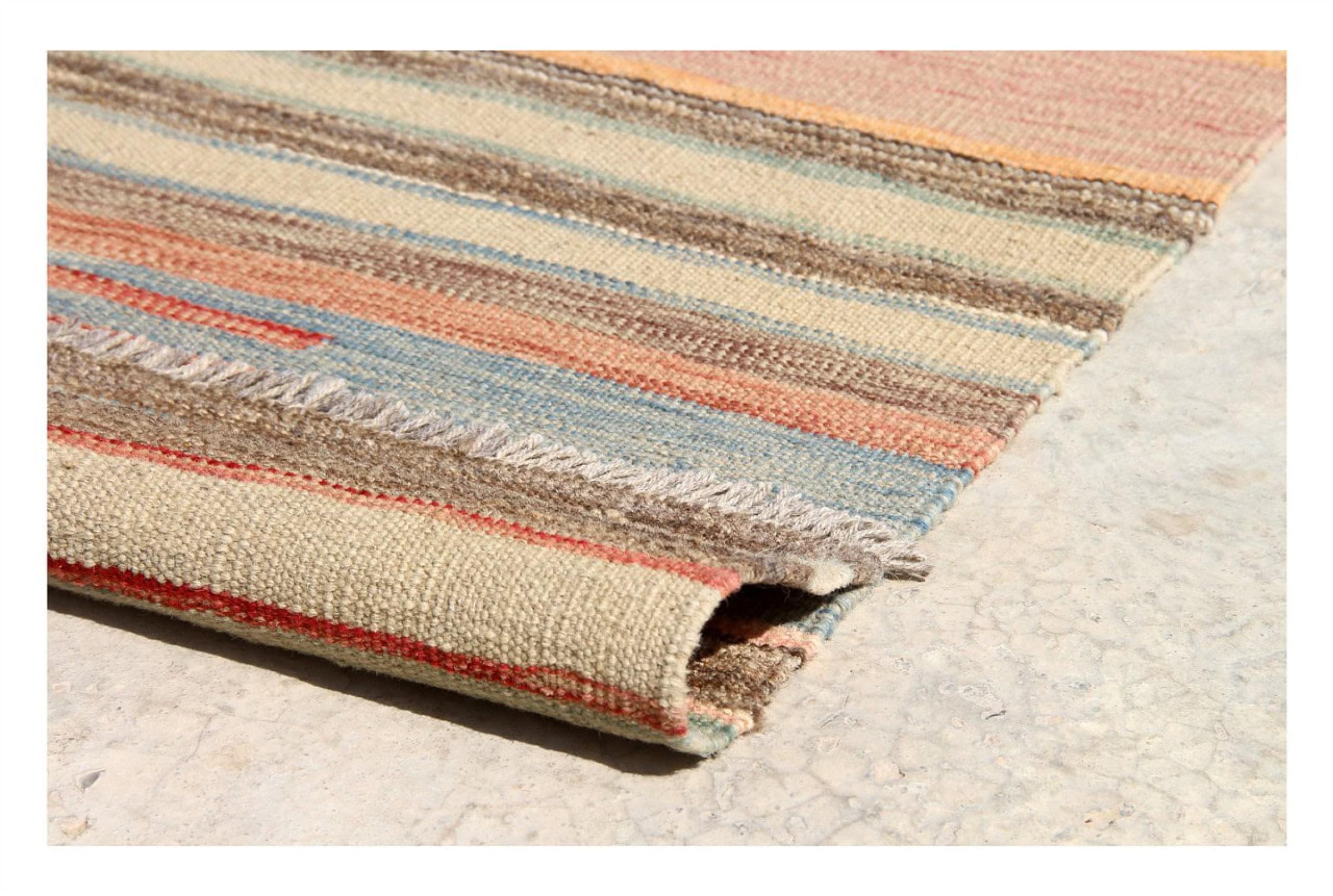 Estas alfombras kilim muestran una diferencia decisiva con las alfombras anudadas a mano - son tejidas a mano. Por lo tanto, no tienen un montón alto de lana y son a menudo más planos y más ásperos que las alfombras de lana anudada. Su fabricación es menos elaborada y por eso suelen ser mucho más baratas. Como ventaja, las alfombras de kilim son también mucho más ligeras y pueden ser colocadas por delante y por detrás. Los kilims tejidos a mano provienen originalmente de la antigua Persia y ahora también se fabrican a menudo en el Afganistán. Tienen patrones bastante simples y directos, que se deben a su técnica de tejido.