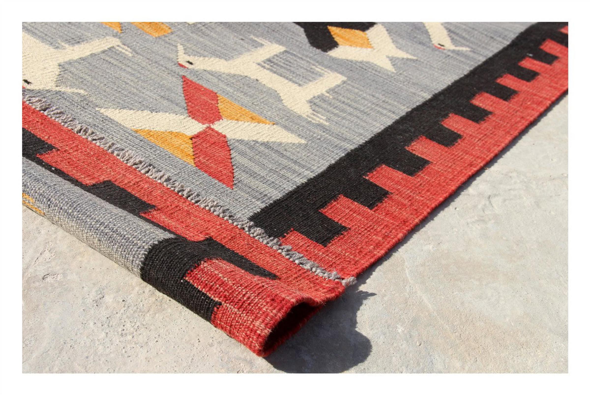 Estas alfombras kilim muestran una diferencia decisiva con las alfombras anudadas a mano - son tejidas a mano. Por lo tanto, no tienen un montón alto de lana y son a menudo más planos y más ásperos que las alfombras de lana anudada. Su fabricación es menos elaborada y por eso suelen ser mucho más baratas. Como ventaja, las alfombras de kilim son también mucho más ligeras y pueden ser colocadas por delante y por detrás. Los kilims tejidos a mano provienen originalmente de la antigua Persia y ahora también se fabrican a menudo en el Afganistán. Tienen patrones bastante simples y directos, que se deben a su técnica de tejido.