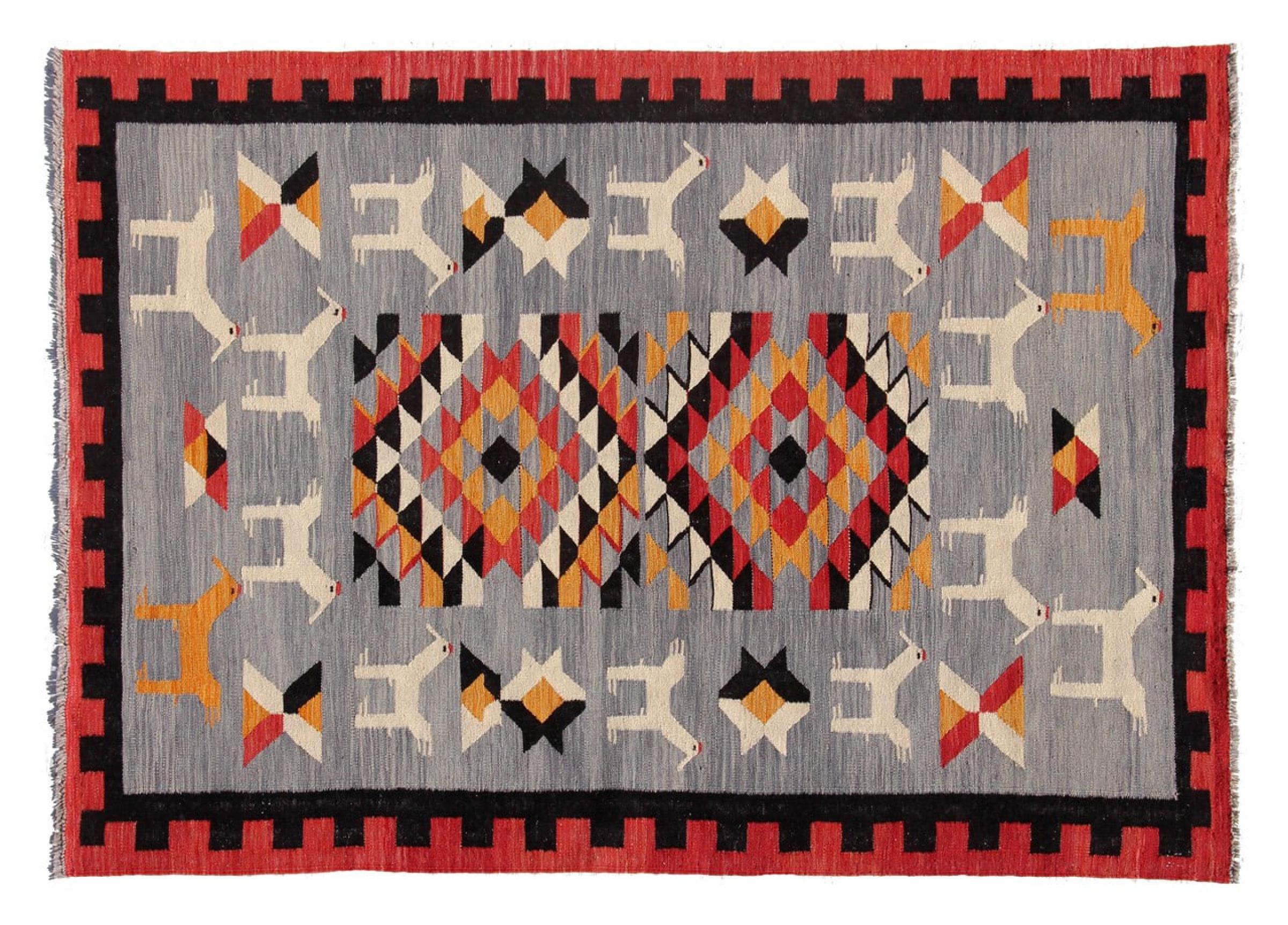Esta alfombra fue hecha a mano en un telar como un tejido plano. Tejido plano es el término utilizado para describir las alfombras que no tienen pelo. Como el nombre promete, estas alfombras están tejidas y no anudadas. Esto resulta en una alfombra plana con una superficie estructurada. Los tejidos planos no son tan suaves y normalmente más delgados que las alfombras anudadas. Al mismo tiempo, su fabricación es mucho menos compleja y por lo general se pueden disponer por ambos lados (frontal y posterior). Sus patrones suelen ser geométricos, lo cual está determinado por el tejido.