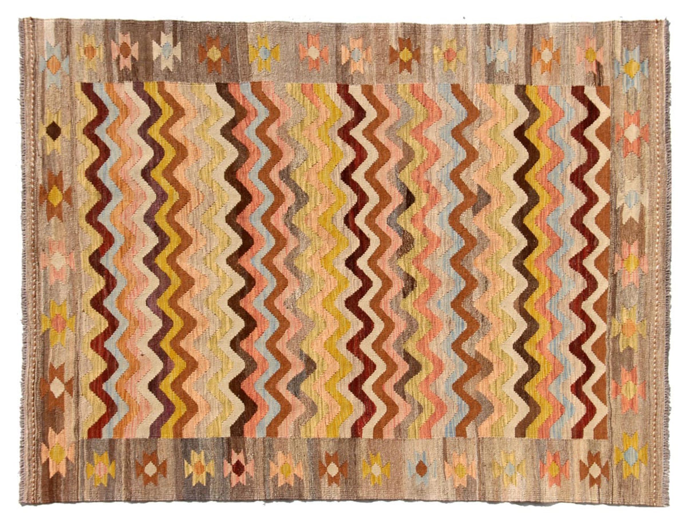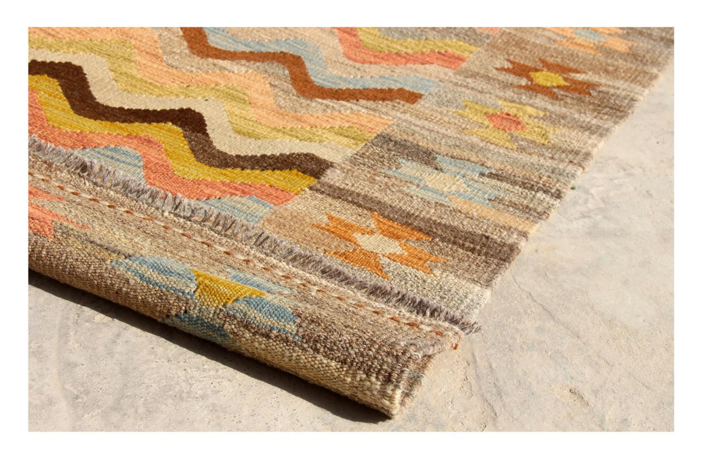 Estas alfombras kilim muestran una diferencia decisiva con las alfombras anudadas a mano - son tejidas a mano. Por lo tanto, no tienen un montón alto de lana y son a menudo más planos y más ásperos que las alfombras de lana anudada. Su fabricación es menos elaborada y por eso suelen ser mucho más baratas. Como ventaja, las alfombras de kilim son también mucho más ligeras y pueden ser colocadas por delante y por detrás. Los kilims tejidos a mano provienen originalmente de la antigua Persia y ahora también se fabrican a menudo en el Afganistán. Tienen patrones bastante simples y directos, que se deben a su técnica de tejido.