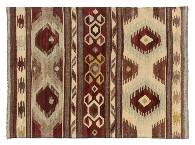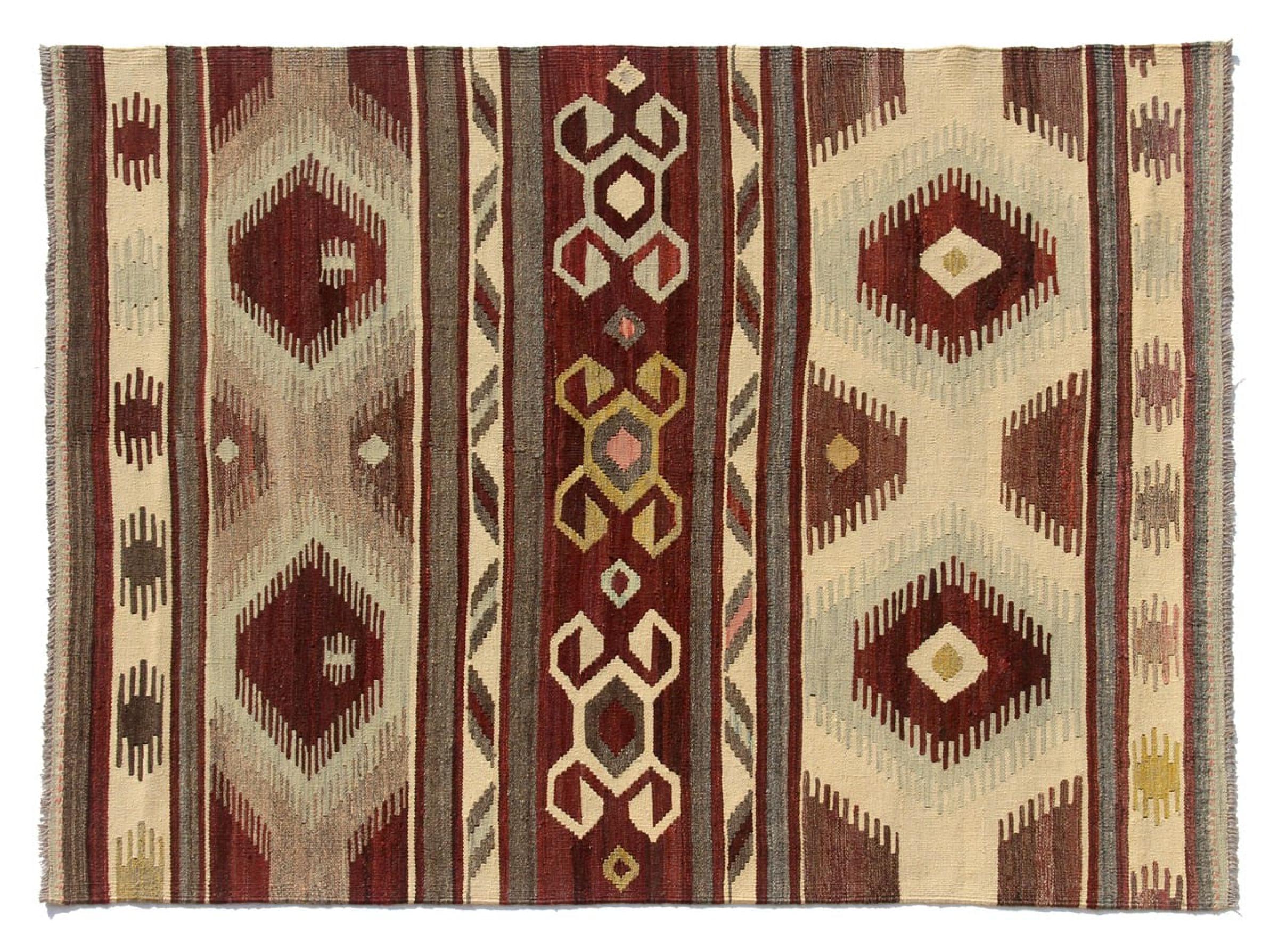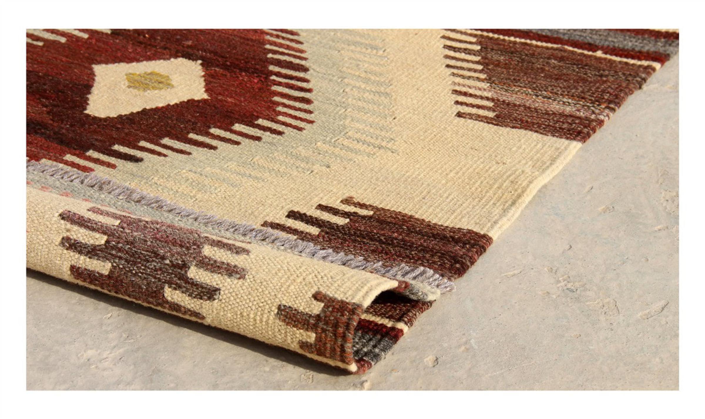 Estas alfombras kilim muestran una diferencia decisiva con las alfombras anudadas a mano - son tejidas a mano. Por lo tanto, no tienen un montón alto de lana y son a menudo más planos y más ásperos que las alfombras de lana anudada. Su fabricación es menos elaborada y por eso suelen ser mucho más baratas. Como ventaja, las alfombras de kilim son también mucho más ligeras y pueden ser colocadas por delante y por detrás. Los kilims tejidos a mano provienen originalmente de la antigua Persia y ahora también se fabrican a menudo en el Afganistán. Tienen patrones bastante simples y directos, que se deben a su técnica de tejido.