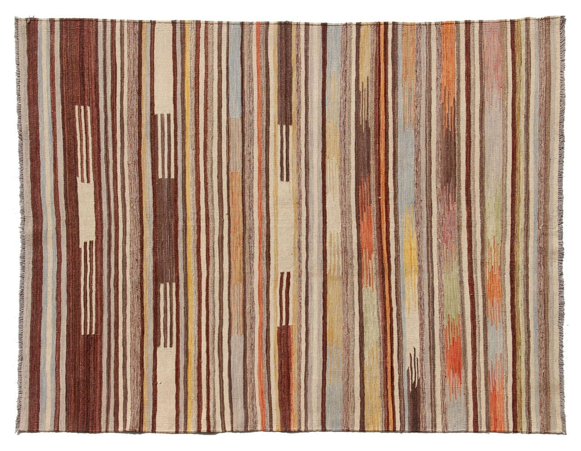 Esta alfombra fue hecha a mano en un telar como un tejido plano. Tejido plano es el término utilizado para describir las alfombras que no tienen pelo. Como el nombre promete, estas alfombras están tejidas y no anudadas. Esto resulta en una alfombra plana con una superficie estructurada. Los tejidos planos no son tan suaves y normalmente más delgados que las alfombras anudadas. Al mismo tiempo, su fabricación es mucho menos compleja y por lo general se pueden disponer por ambos lados (frontal y posterior). Sus patrones suelen ser geométricos, lo cual está determinado por el tejido.