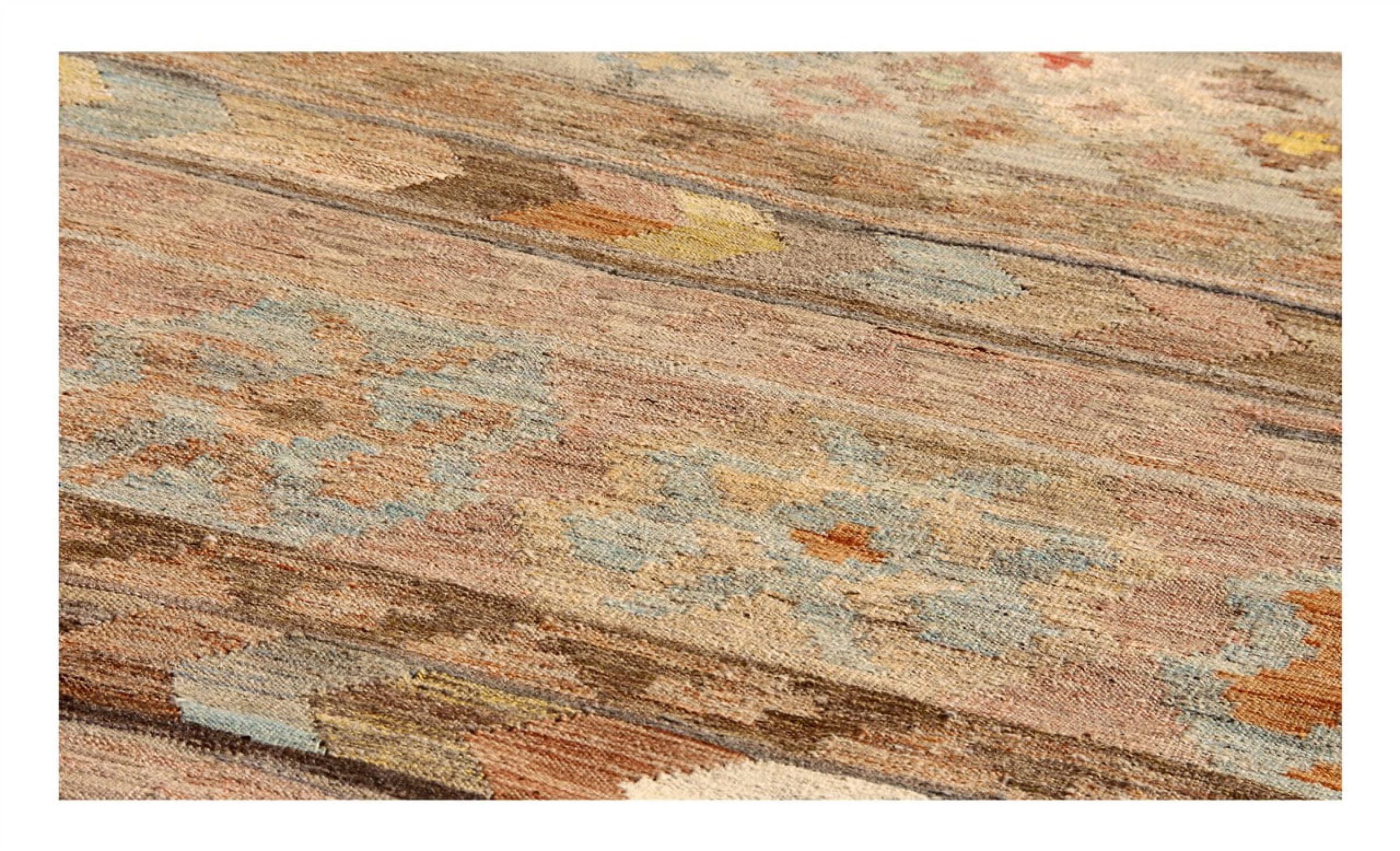 Esta alfombra fue hecha a mano en un telar como un tejido plano. Tejido plano es el término utilizado para describir las alfombras que no tienen pelo. Como el nombre promete, estas alfombras están tejidas y no anudadas. Esto resulta en una alfombra plana con una superficie estructurada. Los tejidos planos no son tan suaves y normalmente más delgados que las alfombras anudadas. Al mismo tiempo, su fabricación es mucho menos compleja y por lo general se pueden disponer por ambos lados (frontal y posterior). Sus patrones suelen ser geométricos, lo cual está determinado por el tejido.