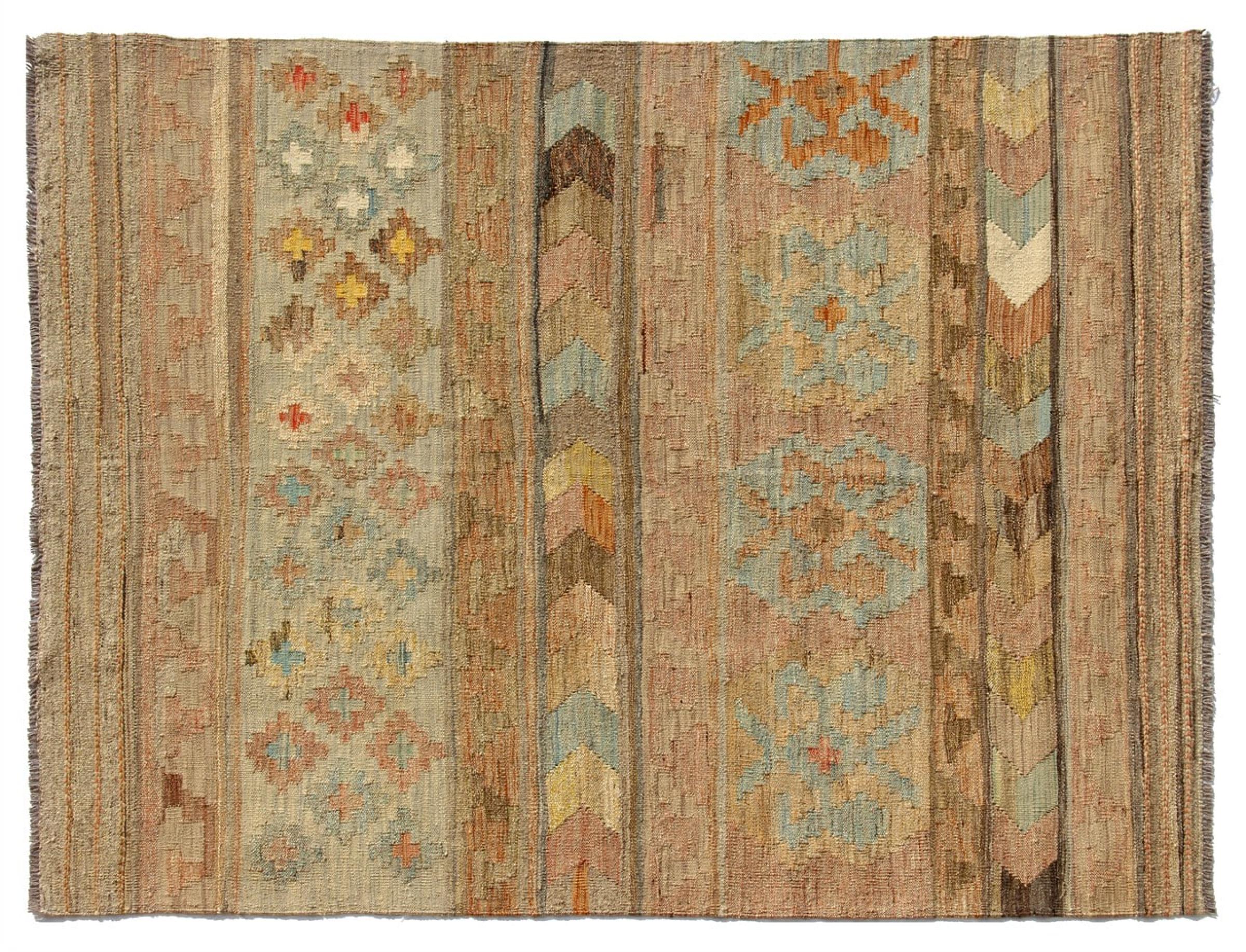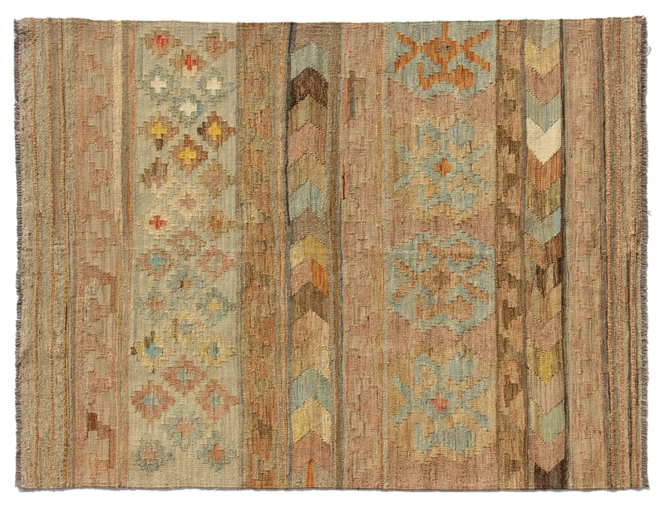 Estas alfombras kilim muestran una diferencia decisiva con las alfombras anudadas a mano - son tejidas a mano. Por lo tanto, no tienen un montón alto de lana y son a menudo más planos y más ásperos que las alfombras de lana anudada. Su fabricación es menos elaborada y por eso suelen ser mucho más baratas. Como ventaja, las alfombras de kilim son también mucho más ligeras y pueden ser colocadas por delante y por detrás. Los kilims tejidos a mano provienen originalmente de la antigua Persia y ahora también se fabrican a menudo en el Afganistán. Tienen patrones bastante simples y directos, que se deben a su técnica de tejido.