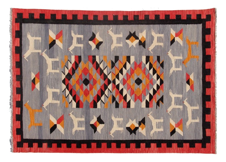 Esta alfombra fue hecha a mano en un telar como un tejido plano. Tejido plano es el término utilizado para describir las alfombras que no tienen pelo. Como el nombre promete, estas alfombras están tejidas y no anudadas. Esto resulta en una alfombra plana con una superficie estructurada. Los tejidos planos no son tan suaves y normalmente más delgados que las alfombras anudadas. Al mismo tiempo, su fabricación es mucho menos compleja y por lo general se pueden disponer por ambos lados (frontal y posterior). Sus patrones suelen ser geométricos, lo cual está determinado por el tejido.