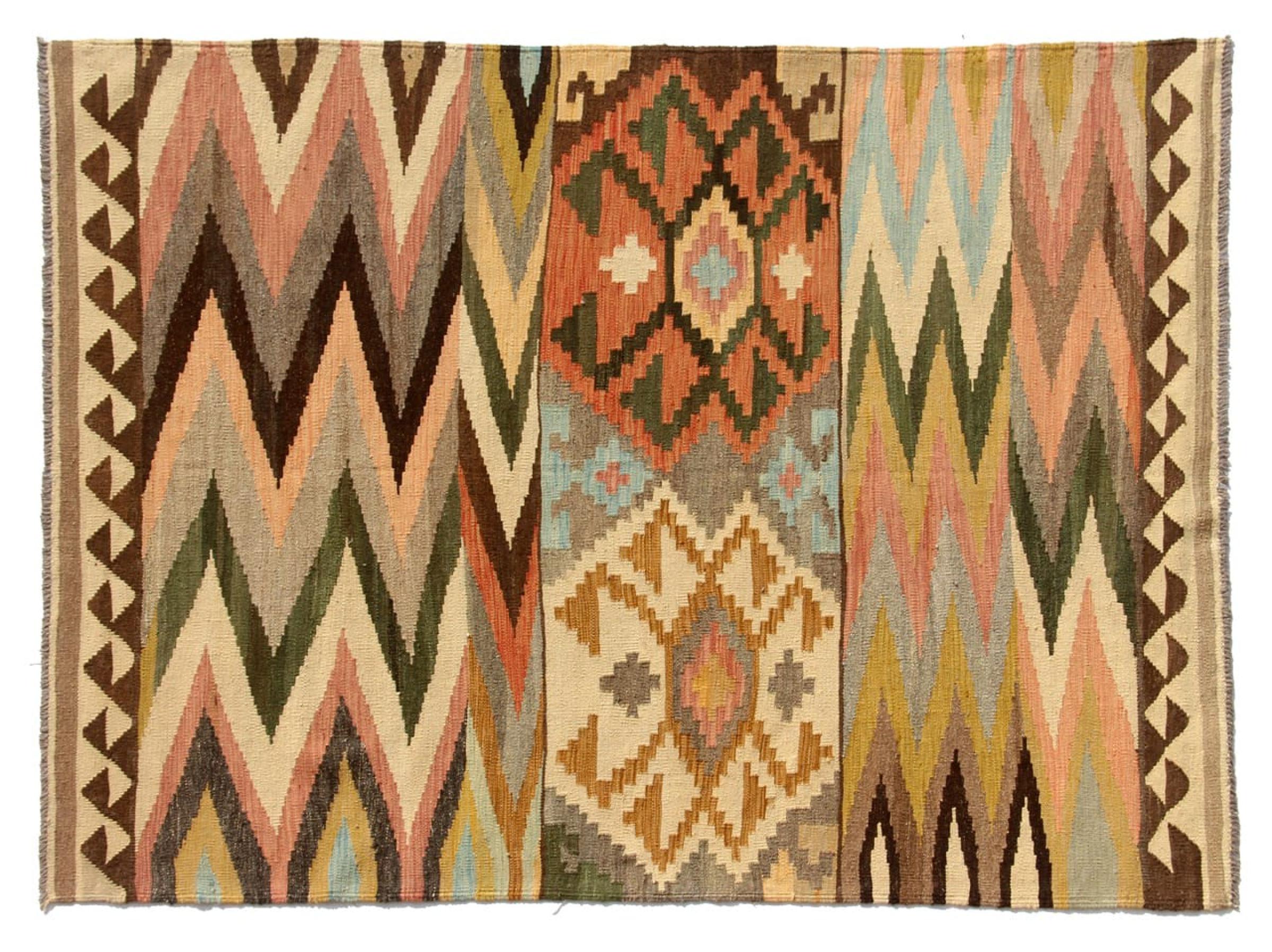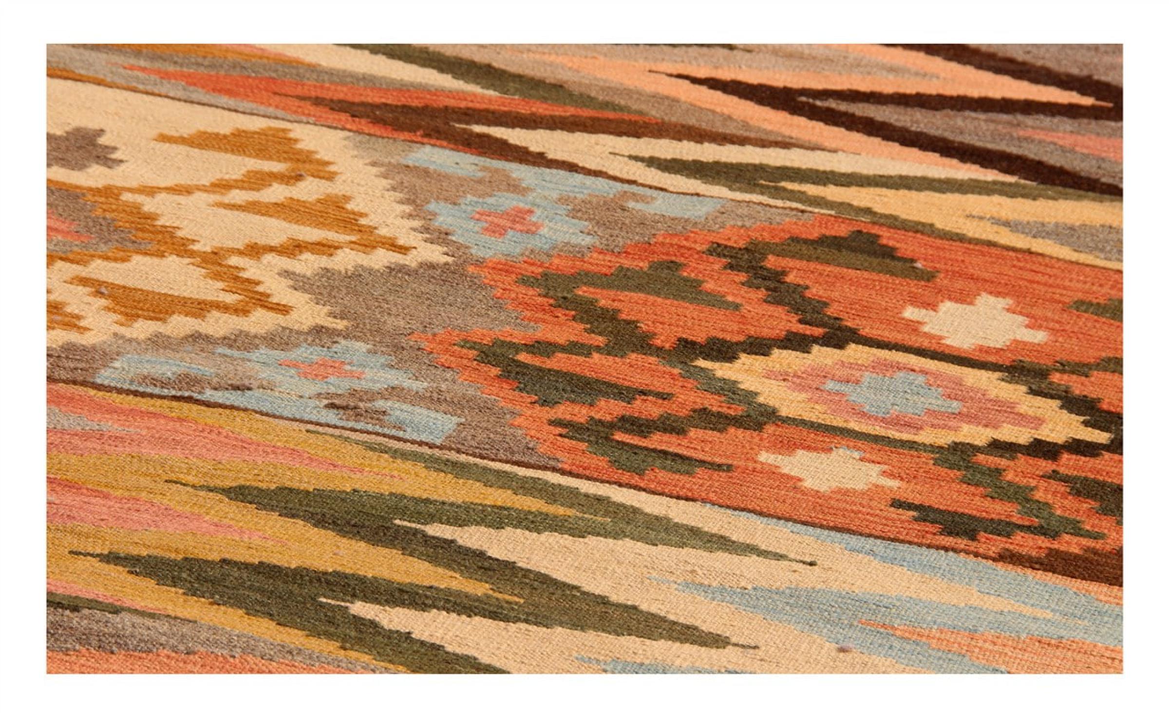 Estas alfombras kilim muestran una diferencia decisiva con las alfombras anudadas a mano - son tejidas a mano. Por lo tanto, no tienen un montón alto de lana y son a menudo más planos y más ásperos que las alfombras de lana anudada. Su fabricación es menos elaborada y por eso suelen ser mucho más baratas. Como ventaja, las alfombras de kilim son también mucho más ligeras y pueden ser colocadas por delante y por detrás. Los kilims tejidos a mano provienen originalmente de la antigua Persia y ahora también se fabrican a menudo en el Afganistán. Tienen patrones bastante simples y directos, que se deben a su técnica de tejido.