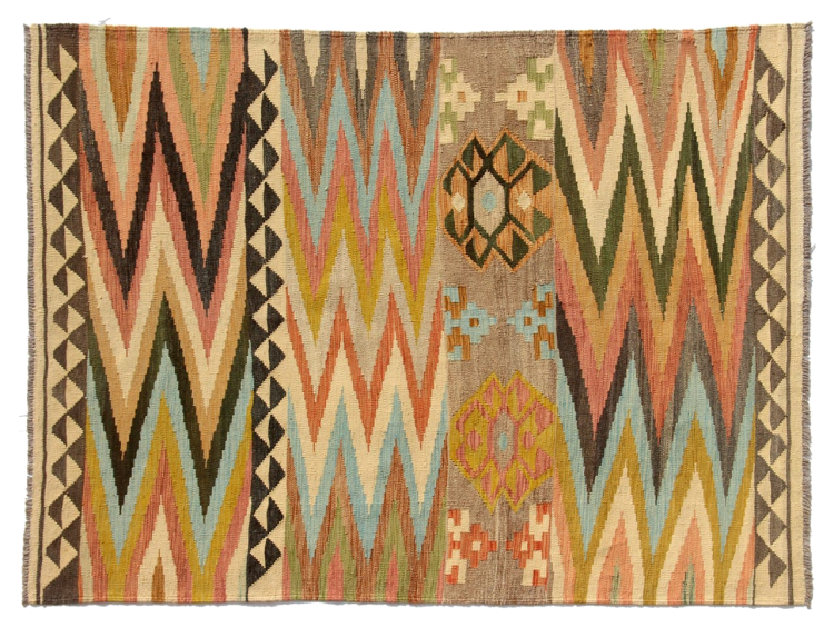 Estas alfombras kilim muestran una diferencia decisiva con las alfombras anudadas a mano - son tejidas a mano. Por lo tanto, no tienen un montón alto de lana y son a menudo más planos y más ásperos que las alfombras de lana anudada. Su fabricación es menos elaborada y por eso suelen ser mucho más baratas. Como ventaja, las alfombras de kilim son también mucho más ligeras y pueden ser colocadas por delante y por detrás. Los kilims tejidos a mano provienen originalmente de la antigua Persia y ahora también se fabrican a menudo en el Afganistán. Tienen patrones bastante simples y directos, que se deben a su técnica de tejido.