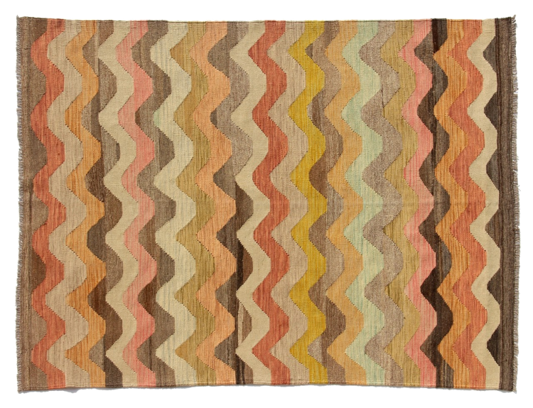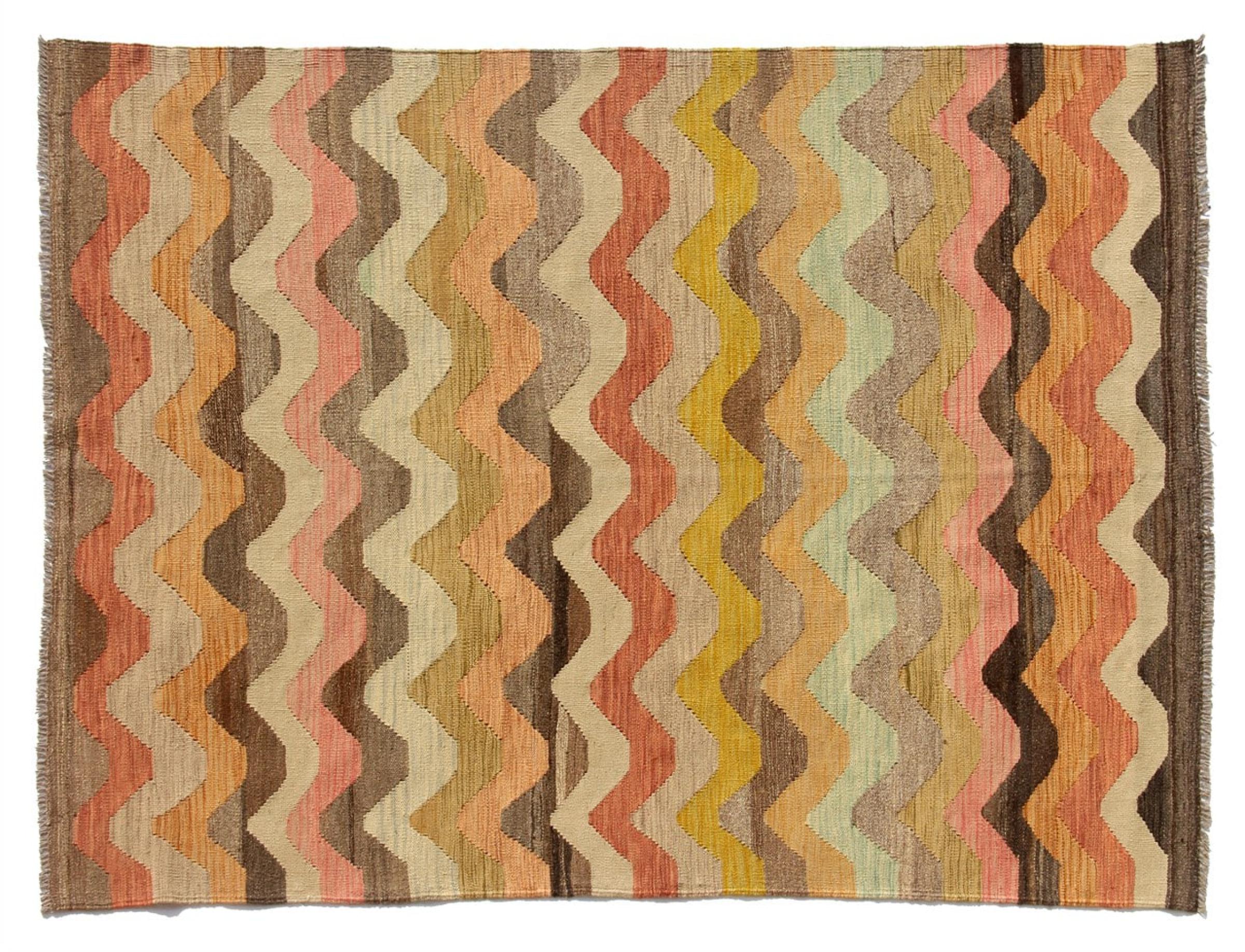 Estas alfombras kilim muestran una diferencia decisiva con las alfombras anudadas a mano - son tejidas a mano. Por lo tanto, no tienen un montón alto de lana y son a menudo más planos y más ásperos que las alfombras de lana anudada. Su fabricación es menos elaborada y por eso suelen ser mucho más baratas. Como ventaja, las alfombras de kilim son también mucho más ligeras y pueden ser colocadas por delante y por detrás. Los kilims tejidos a mano provienen originalmente de la antigua Persia y ahora también se fabrican a menudo en el Afganistán. Tienen patrones bastante simples y directos, que se deben a su técnica de tejido.