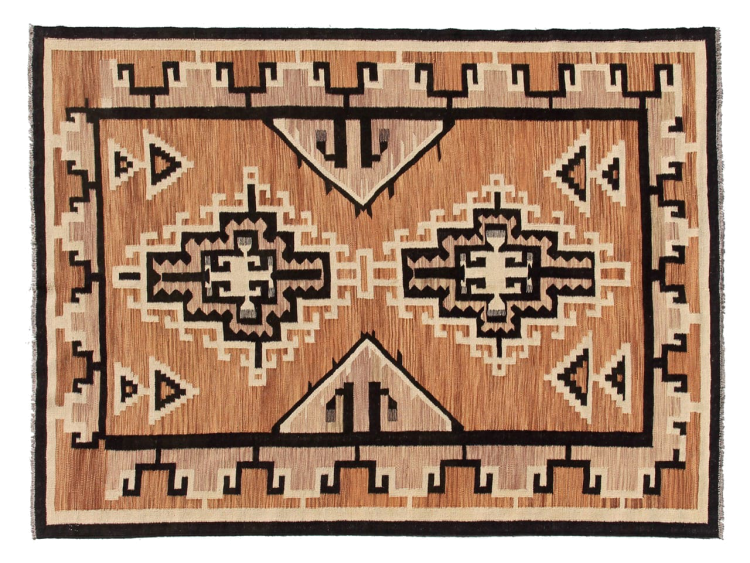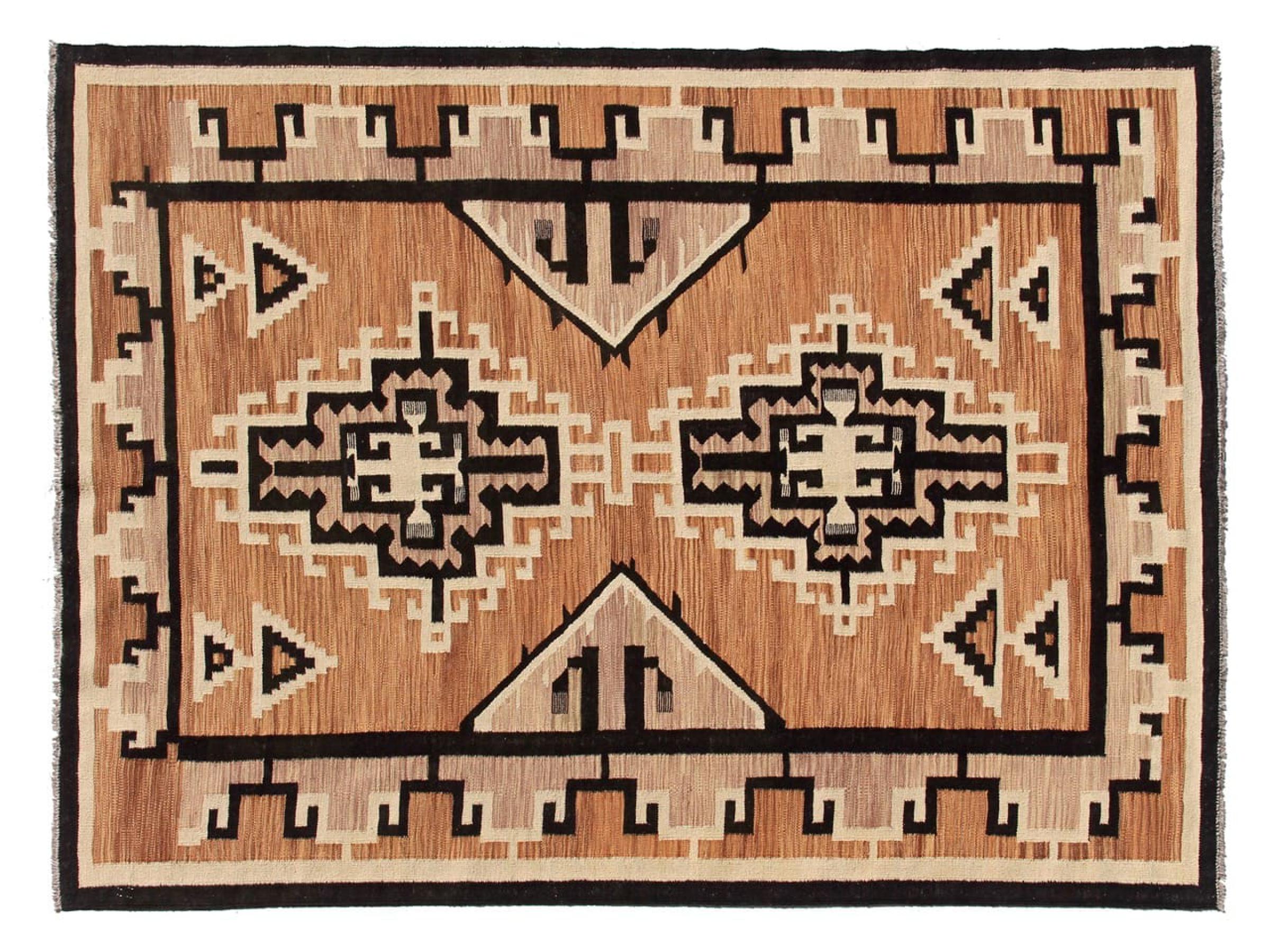 Esta alfombra fue hecha a mano en un telar como un tejido plano. Tejido plano es el término utilizado para describir las alfombras que no tienen pelo. Como el nombre promete, estas alfombras están tejidas y no anudadas. Esto resulta en una alfombra plana con una superficie estructurada. Los tejidos planos no son tan suaves y normalmente más delgados que las alfombras anudadas. Al mismo tiempo, su fabricación es mucho menos compleja y por lo general se pueden disponer por ambos lados (frontal y posterior). Sus patrones suelen ser geométricos, lo cual está determinado por el tejido.