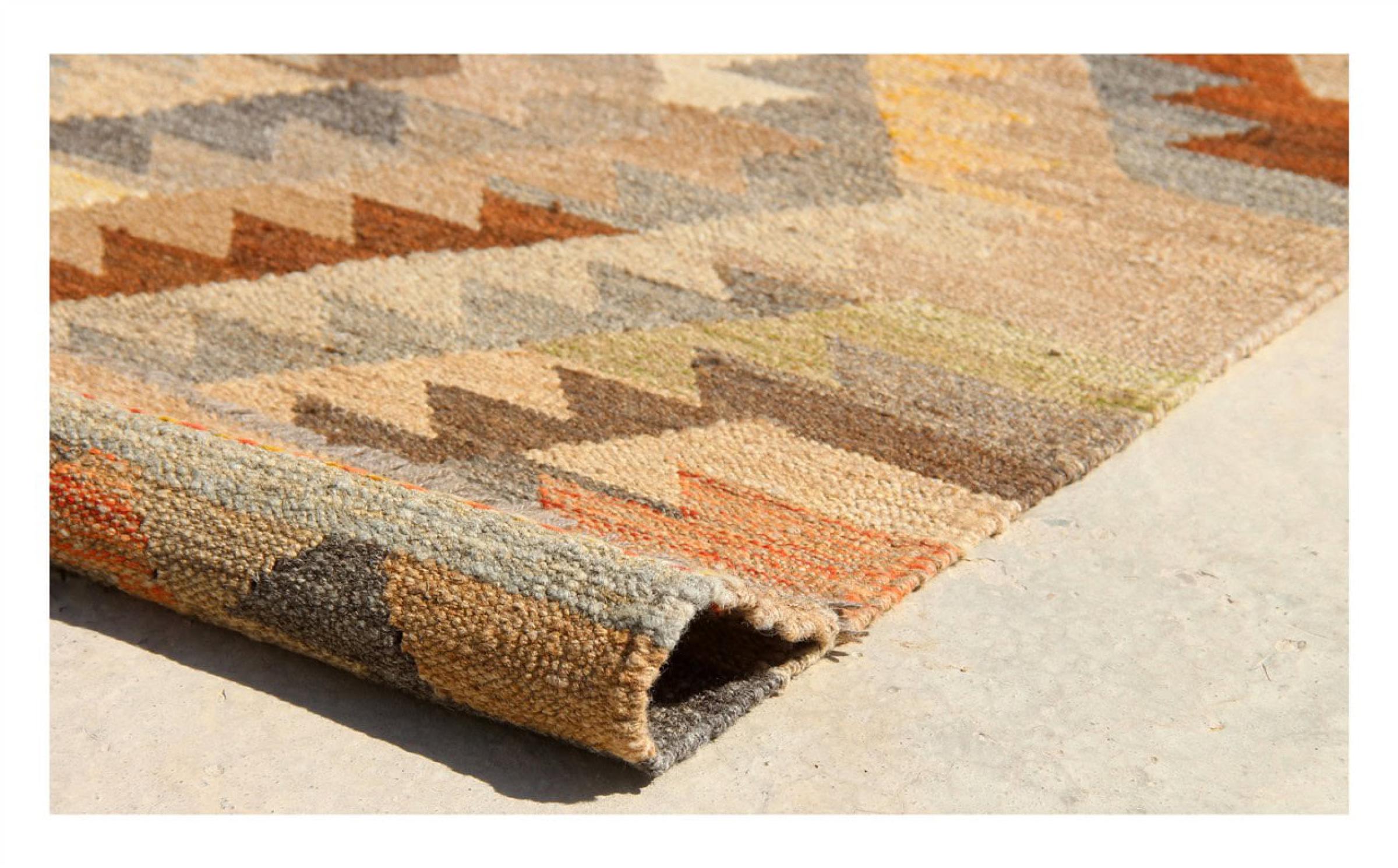 Esta alfombra fue hecha a mano en un telar como un tejido plano. Tejido plano es el término utilizado para describir las alfombras que no tienen pelo. Como el nombre promete, estas alfombras están tejidas y no anudadas. Esto resulta en una alfombra plana con una superficie estructurada. Los tejidos planos no son tan suaves y normalmente más delgados que las alfombras anudadas. Al mismo tiempo, su fabricación es mucho menos compleja y por lo general se pueden disponer por ambos lados (frontal y posterior). Sus patrones suelen ser geométricos, lo cual está determinado por el tejido.