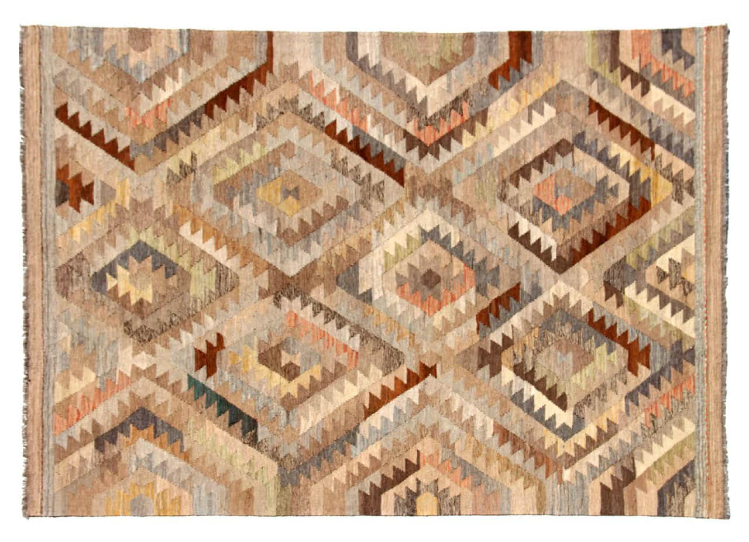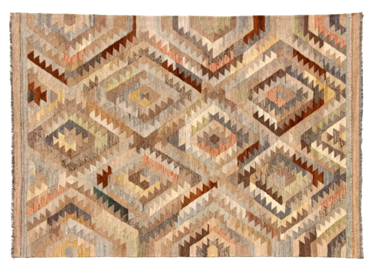 Estas alfombras kilim muestran una diferencia decisiva con las alfombras anudadas a mano - son tejidas a mano. Por lo tanto, no tienen un montón alto de lana y son a menudo más planos y más ásperos que las alfombras de lana anudada. Su fabricación es menos elaborada y por eso suelen ser mucho más baratas. Como ventaja, las alfombras de kilim son también mucho más ligeras y pueden ser colocadas por delante y por detrás. Los kilims tejidos a mano provienen originalmente de la antigua Persia y ahora también se fabrican a menudo en el Afganistán. Tienen patrones bastante simples y directos, que se deben a su técnica de tejido.