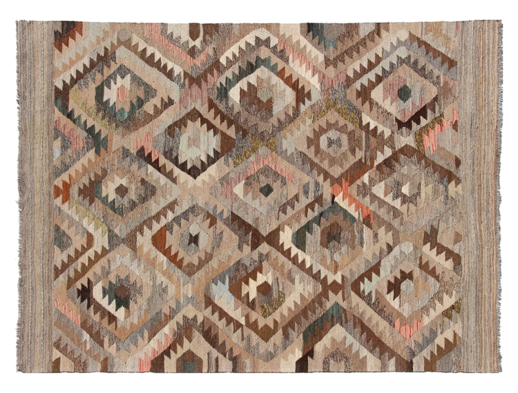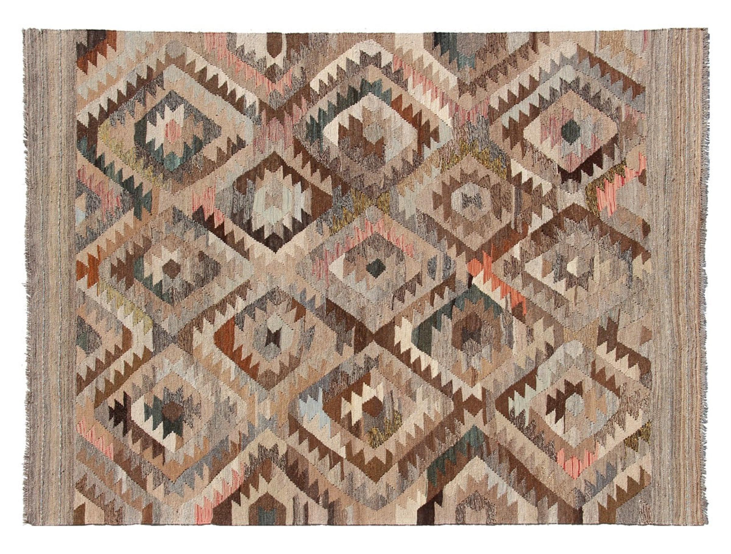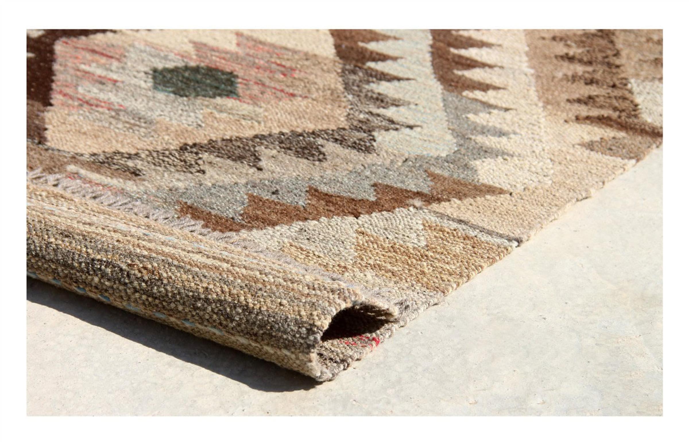 Estas alfombras kilim muestran una diferencia decisiva con las alfombras anudadas a mano - son tejidas a mano. Por lo tanto, no tienen un montón alto de lana y son a menudo más planos y más ásperos que las alfombras de lana anudada. Su fabricación es menos elaborada y por eso suelen ser mucho más baratas. Como ventaja, las alfombras de kilim son también mucho más ligeras y pueden ser colocadas por delante y por detrás. Los kilims tejidos a mano provienen originalmente de la antigua Persia y ahora también se fabrican a menudo en el Afganistán. Tienen patrones bastante simples y directos, que se deben a su técnica de tejido.