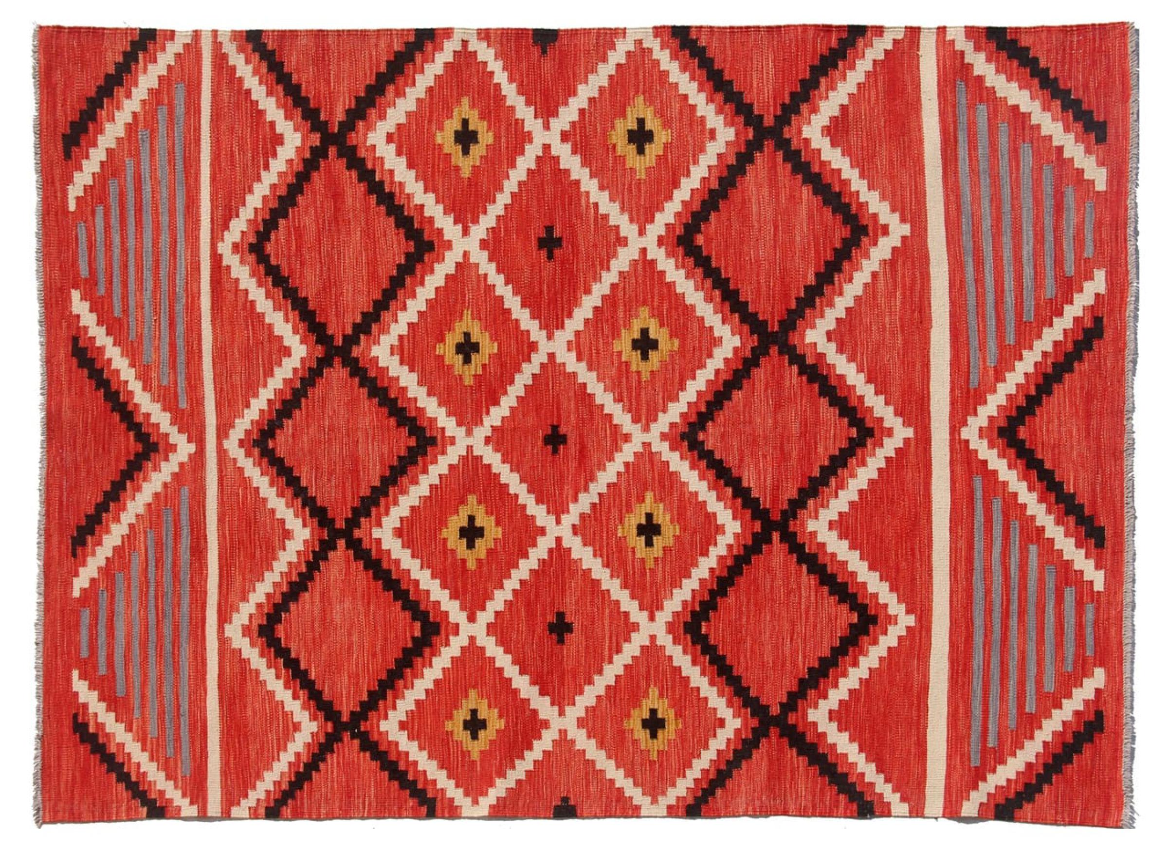 Estas alfombras kilim muestran una diferencia decisiva con las alfombras anudadas a mano - son tejidas a mano. Por lo tanto, no tienen un montón alto de lana y son a menudo más planos y más ásperos que las alfombras de lana anudada. Su fabricación es menos elaborada y por eso suelen ser mucho más baratas. Como ventaja, las alfombras de kilim son también mucho más ligeras y pueden ser colocadas por delante y por detrás. Los kilims tejidos a mano provienen originalmente de la antigua Persia y ahora también se fabrican a menudo en el Afganistán. Tienen patrones bastante simples y directos, que se deben a su técnica de tejido.