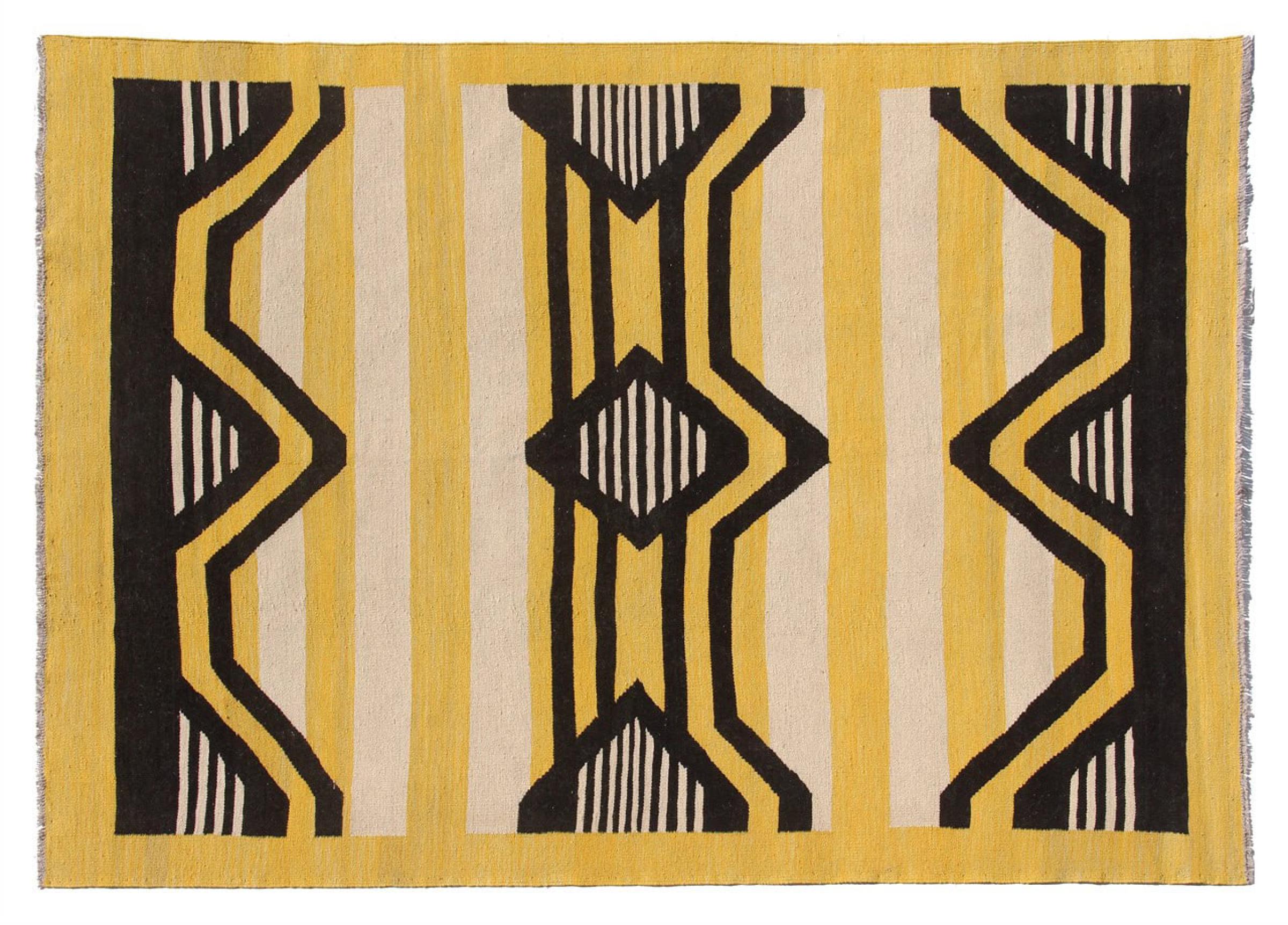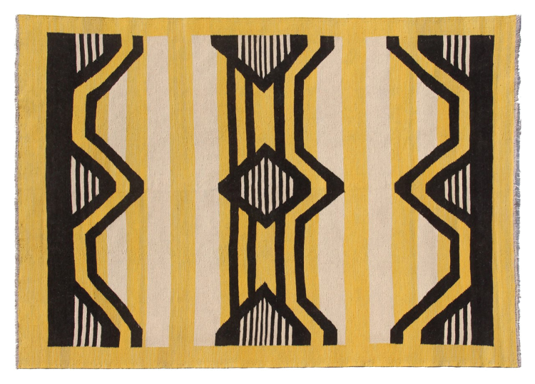 Esta alfombra fue hecha a mano en un telar como un tejido plano. Tejido plano es el término utilizado para describir las alfombras que no tienen pelo. Como el nombre promete, estas alfombras están tejidas y no anudadas. Esto resulta en una alfombra plana con una superficie estructurada. Los tejidos planos no son tan suaves y normalmente más delgados que las alfombras anudadas. Al mismo tiempo, su fabricación es mucho menos compleja y por lo general se pueden disponer por ambos lados (frontal y posterior). Sus patrones suelen ser geométricos, lo cual está determinado por el tejido.