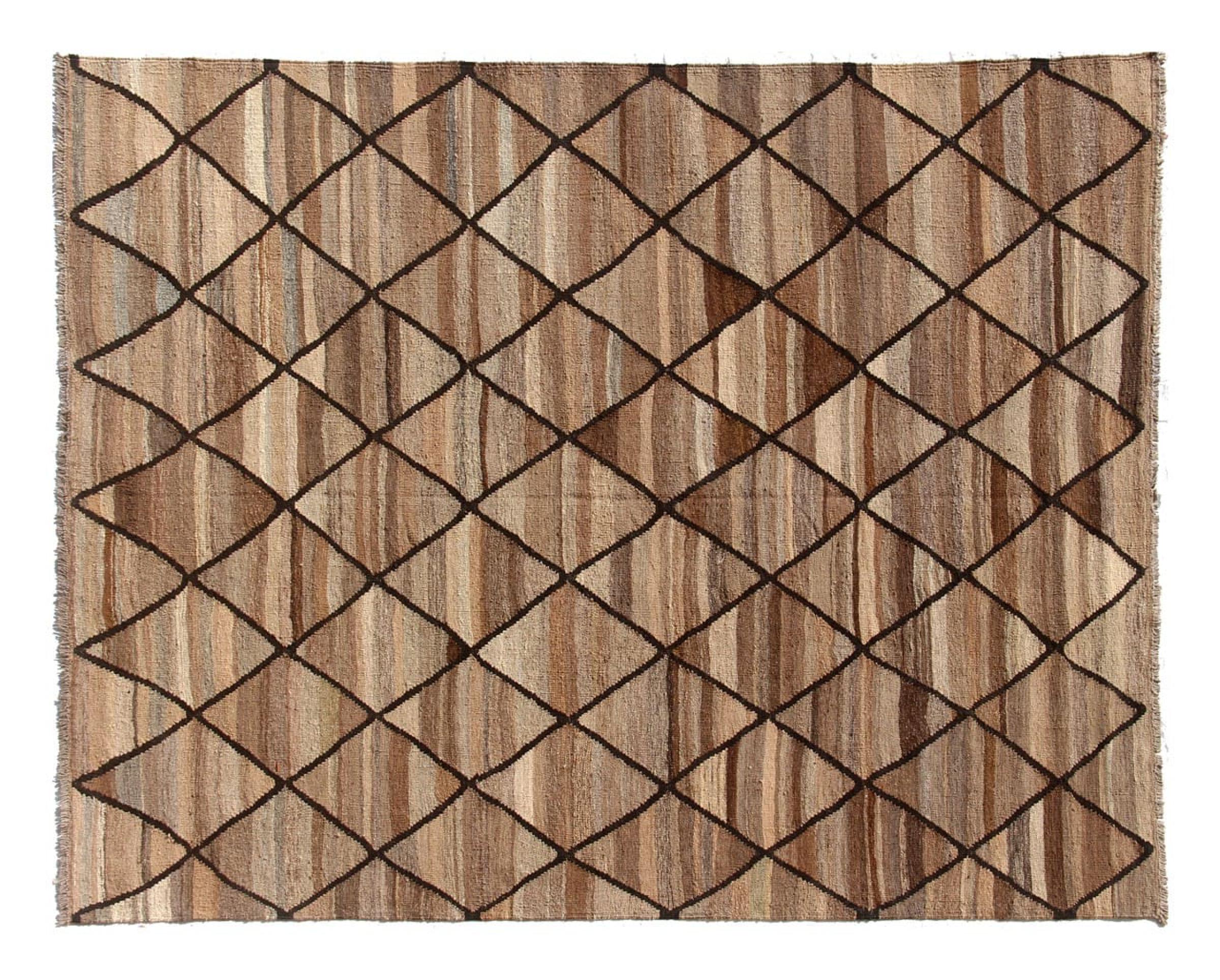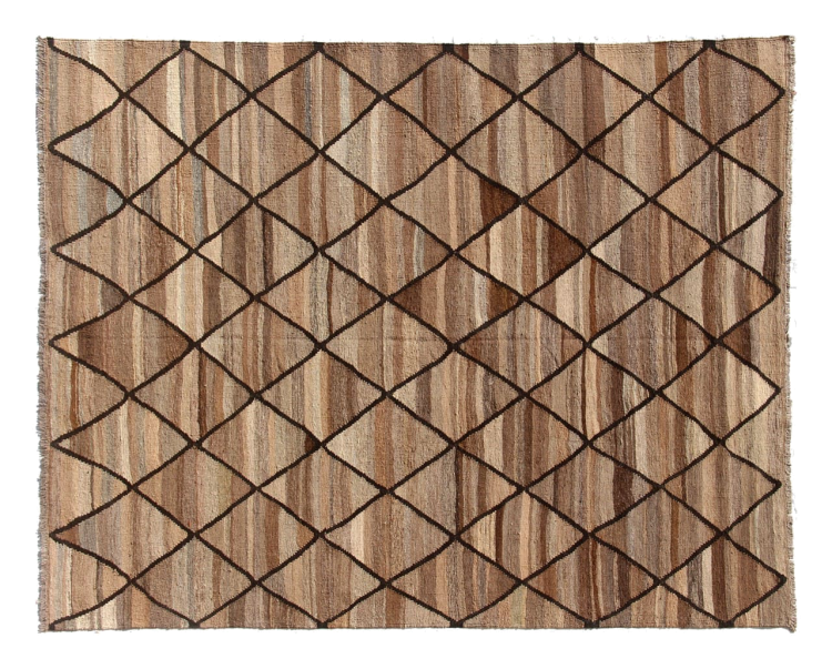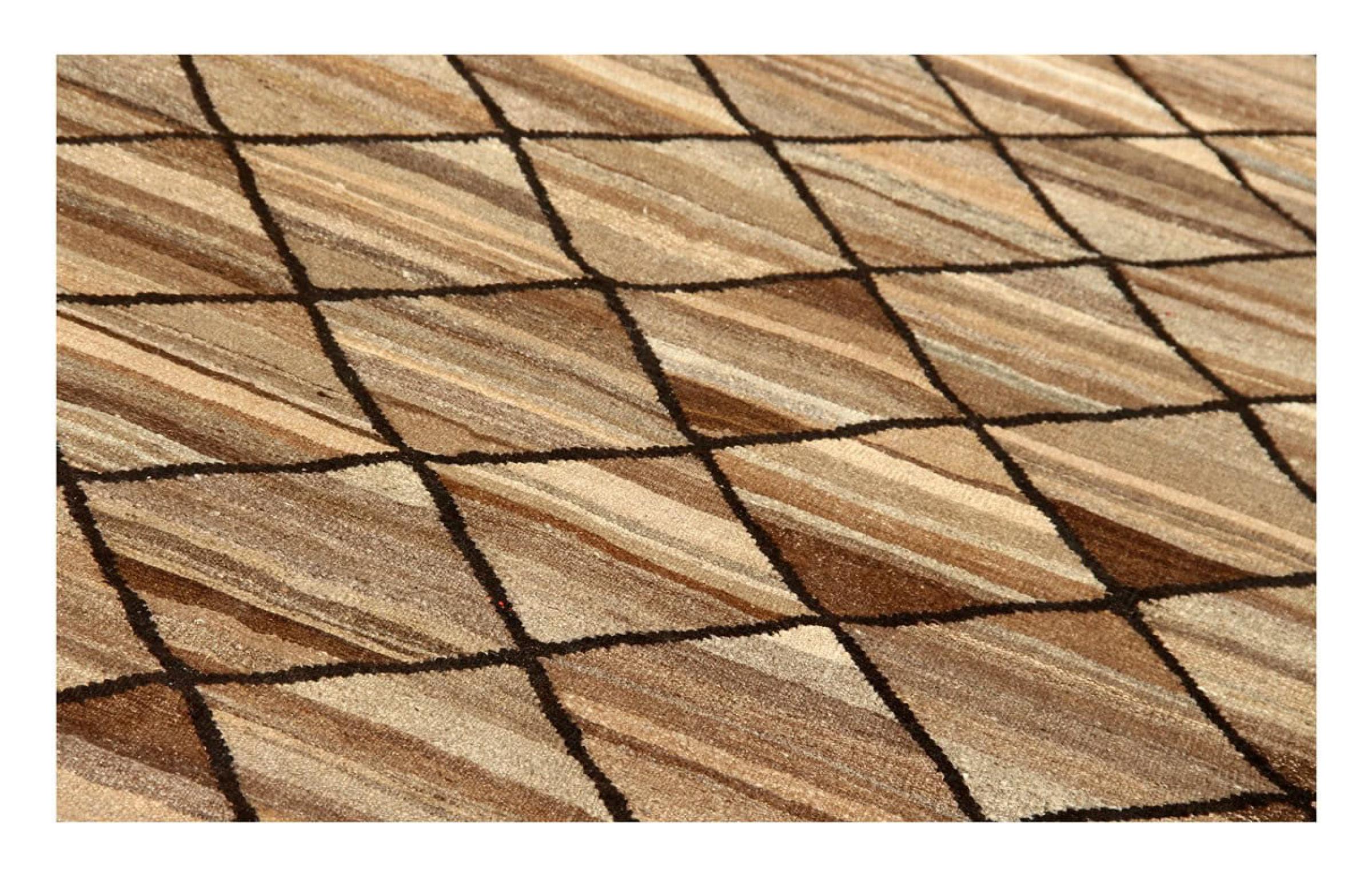 Esta alfombra fue hecha a mano en un telar como un tejido plano. Tejido plano es el término utilizado para describir las alfombras que no tienen pelo. Como el nombre promete, estas alfombras están tejidas y no anudadas. Esto resulta en una alfombra plana con una superficie estructurada. Los tejidos planos no son tan suaves y normalmente más delgados que las alfombras anudadas. Al mismo tiempo, su fabricación es mucho menos compleja y por lo general se pueden disponer por ambos lados (frontal y posterior). Sus patrones suelen ser geométricos, lo cual está determinado por el tejido.