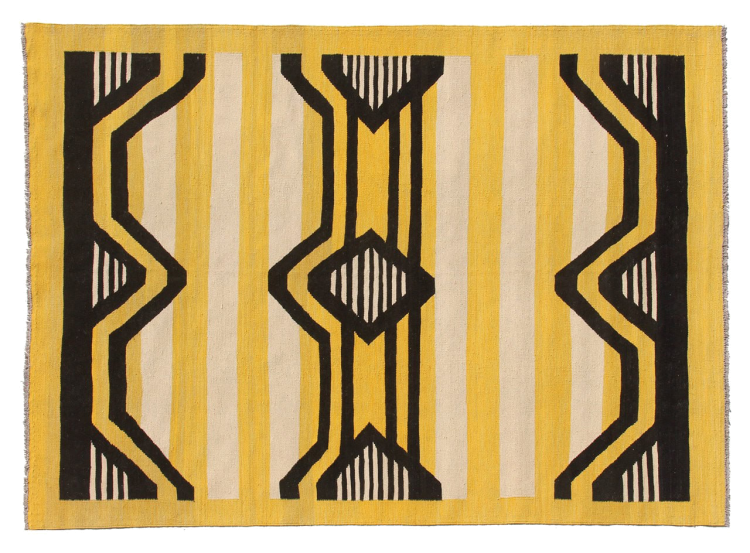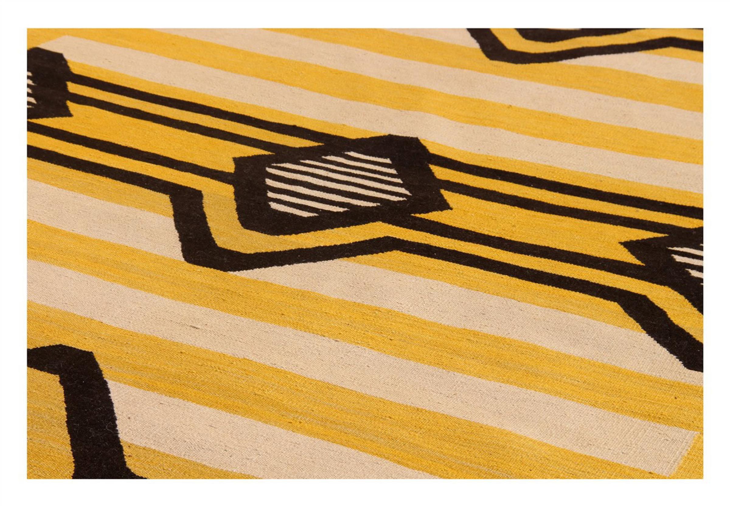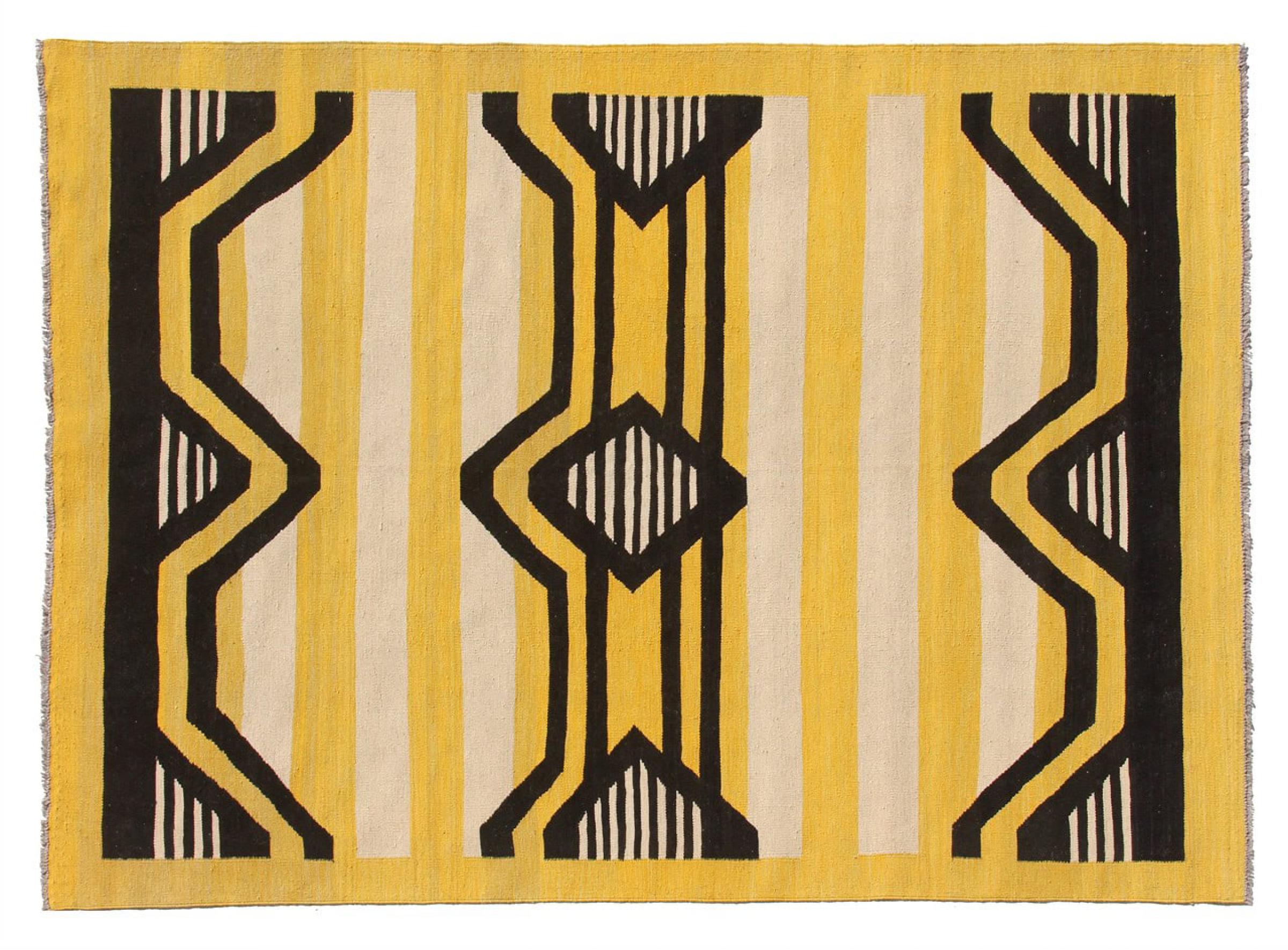 Esta alfombra fue hecha a mano en un telar como un tejido plano. Tejido plano es el término utilizado para describir las alfombras que no tienen pelo. Como el nombre promete, estas alfombras están tejidas y no anudadas. Esto resulta en una alfombra plana con una superficie estructurada. Los tejidos planos no son tan suaves y normalmente más delgados que las alfombras anudadas. Al mismo tiempo, su fabricación es mucho menos compleja y por lo general se pueden disponer por ambos lados (frontal y posterior). Sus patrones suelen ser geométricos, lo cual está determinado por el tejido.