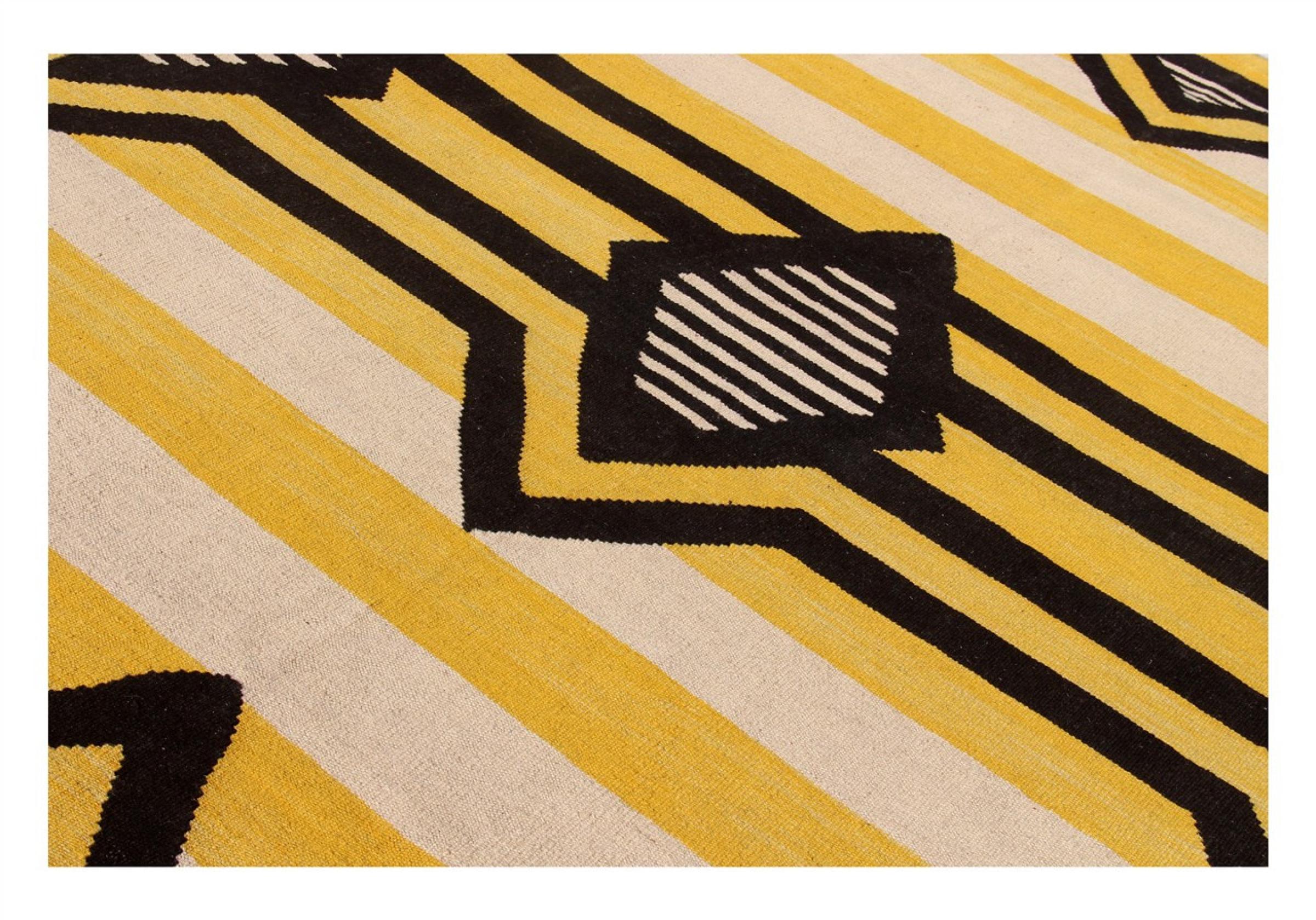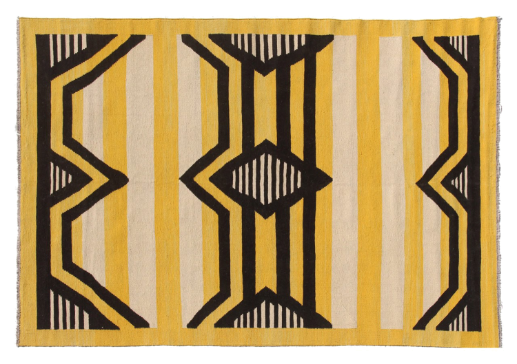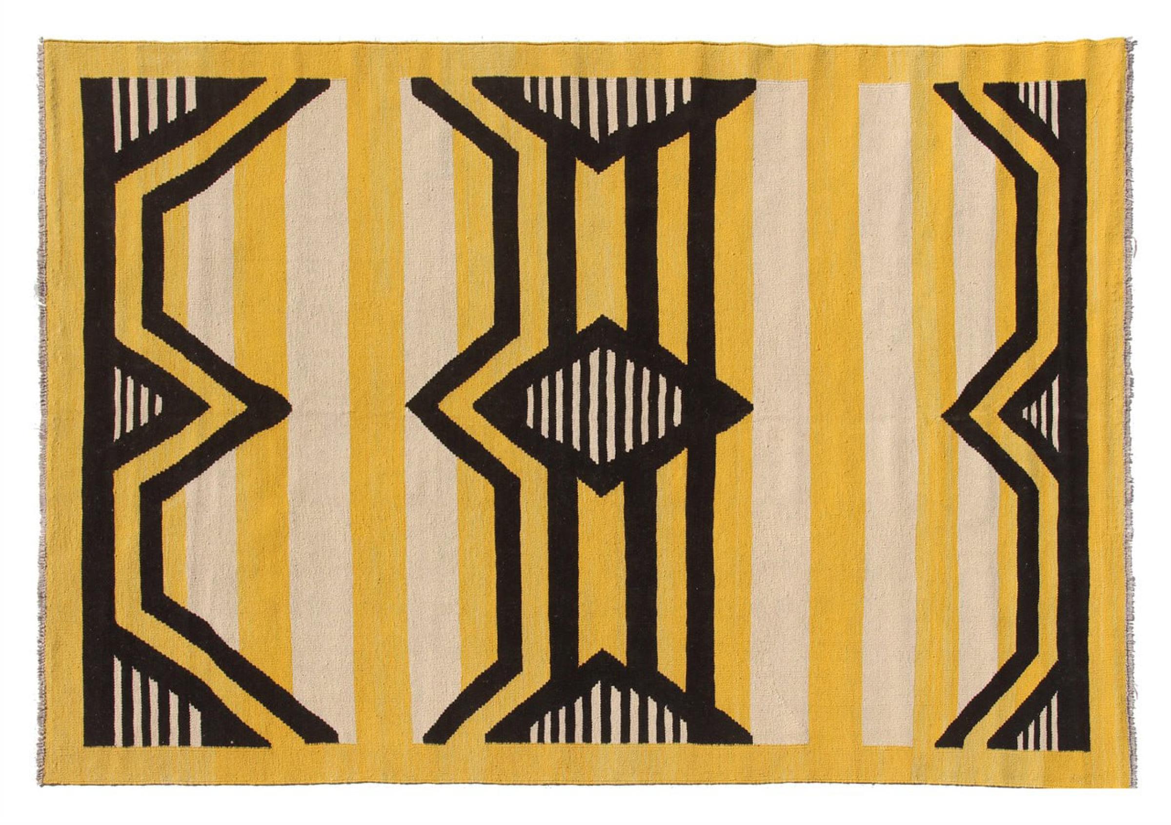 Esta alfombra fue hecha a mano en un telar como un tejido plano. Tejido plano es el término utilizado para describir las alfombras que no tienen pelo. Como el nombre promete, estas alfombras están tejidas y no anudadas. Esto resulta en una alfombra plana con una superficie estructurada. Los tejidos planos no son tan suaves y normalmente más delgados que las alfombras anudadas. Al mismo tiempo, su fabricación es mucho menos compleja y por lo general se pueden disponer por ambos lados (frontal y posterior). Sus patrones suelen ser geométricos, lo cual está determinado por el tejido.