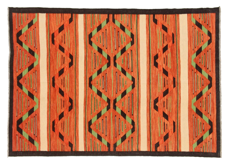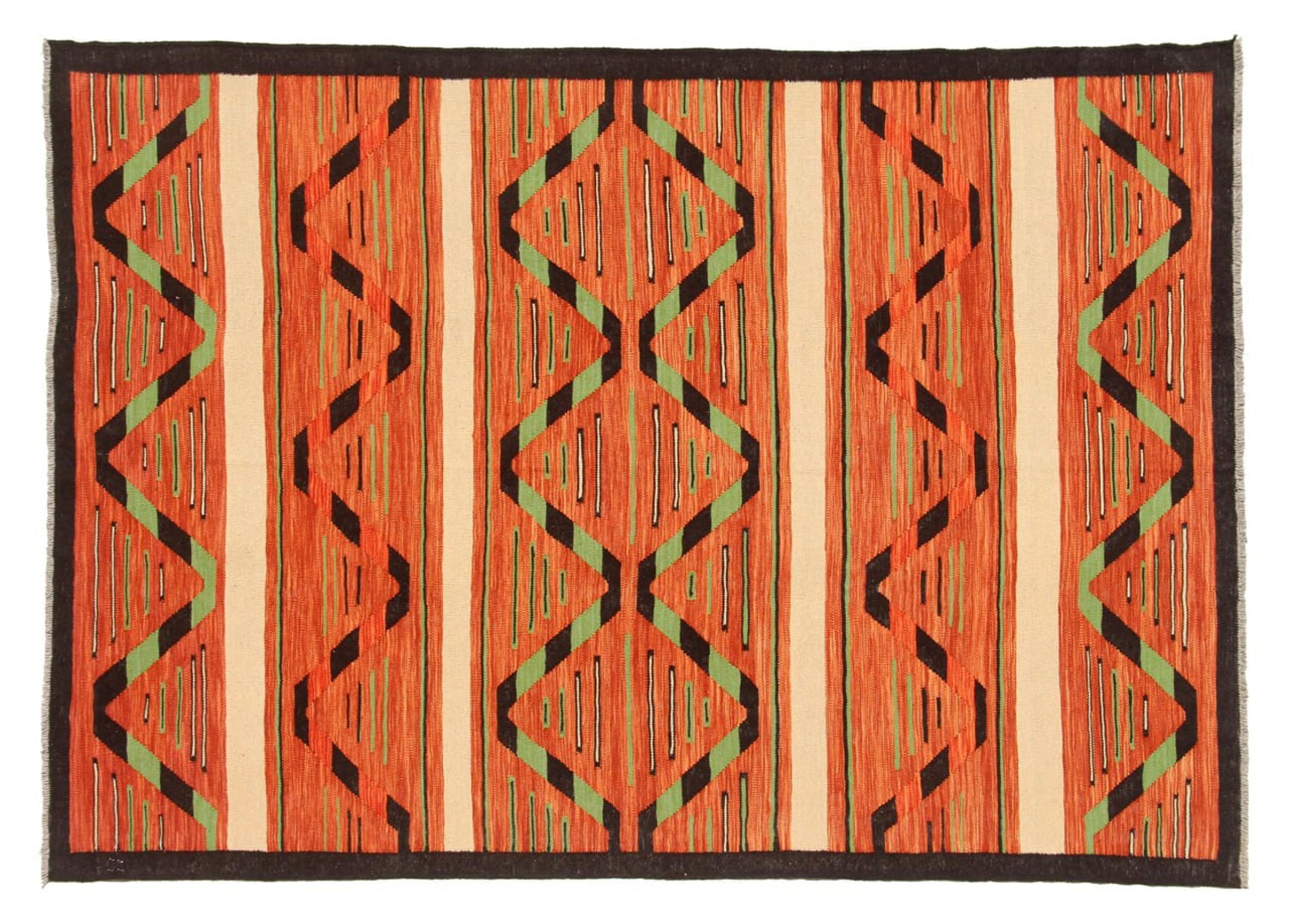 Esta alfombra fue hecha a mano en un telar como un tejido plano. Tejido plano es el término utilizado para describir las alfombras que no tienen pelo. Como el nombre promete, estas alfombras están tejidas y no anudadas. Esto resulta en una alfombra plana con una superficie estructurada. Los tejidos planos no son tan suaves y normalmente más delgados que las alfombras anudadas. Al mismo tiempo, su fabricación es mucho menos compleja y por lo general se pueden disponer por ambos lados (frontal y posterior). Sus patrones suelen ser geométricos, lo cual está determinado por el tejido.