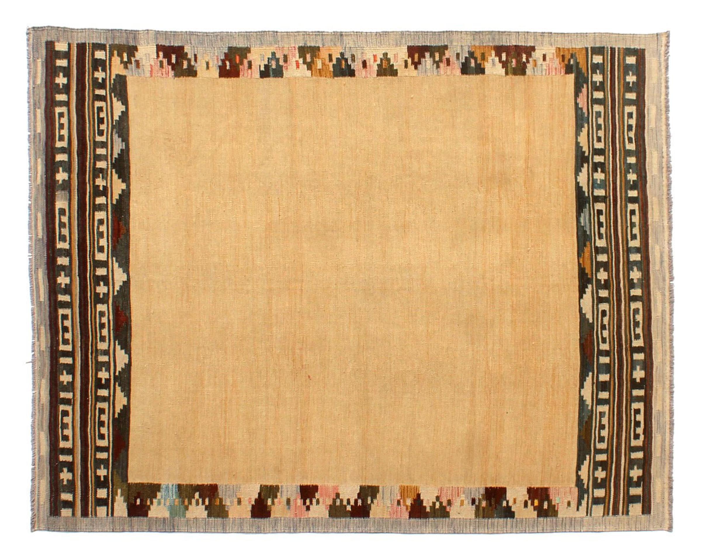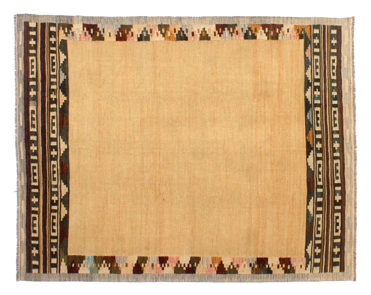 Esta alfombra fue hecha a mano en un telar como un tejido plano. Tejido plano es el término utilizado para describir las alfombras que no tienen pelo. Como el nombre promete, estas alfombras están tejidas y no anudadas. Esto resulta en una alfombra plana con una superficie estructurada. Los tejidos planos no son tan suaves y normalmente más delgados que las alfombras anudadas. Al mismo tiempo, su fabricación es mucho menos compleja y por lo general se pueden disponer por ambos lados (frontal y posterior). Sus patrones suelen ser geométricos, lo cual está determinado por el tejido.