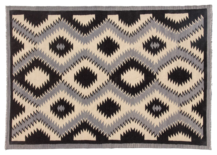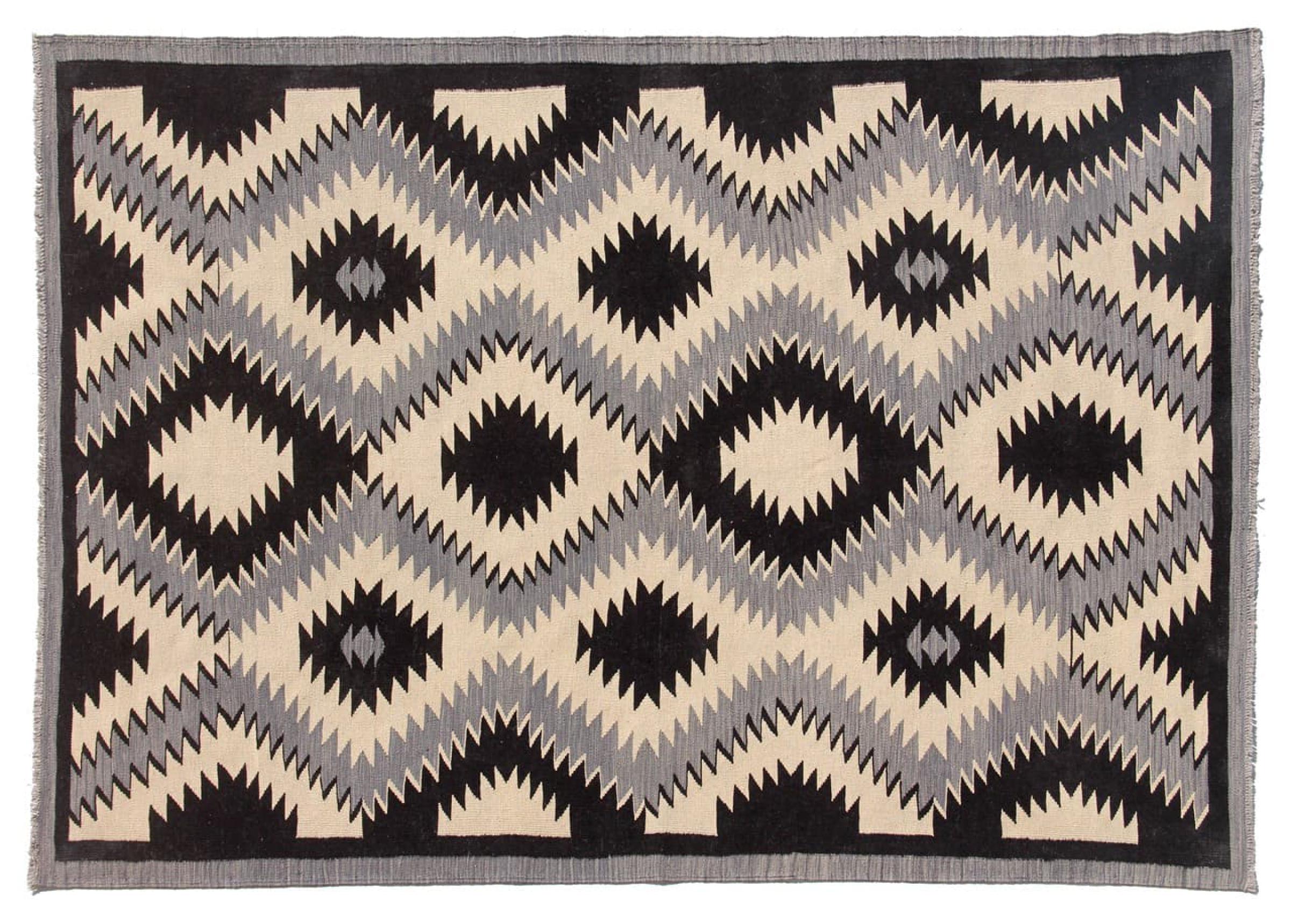 Esta alfombra fue hecha a mano en un telar como un tejido plano. Tejido plano es el término utilizado para describir las alfombras que no tienen pelo. Como el nombre promete, estas alfombras están tejidas y no anudadas. Esto resulta en una alfombra plana con una superficie estructurada. Los tejidos planos no son tan suaves y normalmente más delgados que las alfombras anudadas. Al mismo tiempo, su fabricación es mucho menos compleja y por lo general se pueden disponer por ambos lados (frontal y posterior). Sus patrones suelen ser geométricos, lo cual está determinado por el tejido.