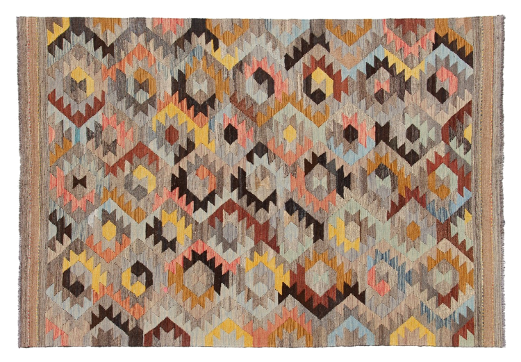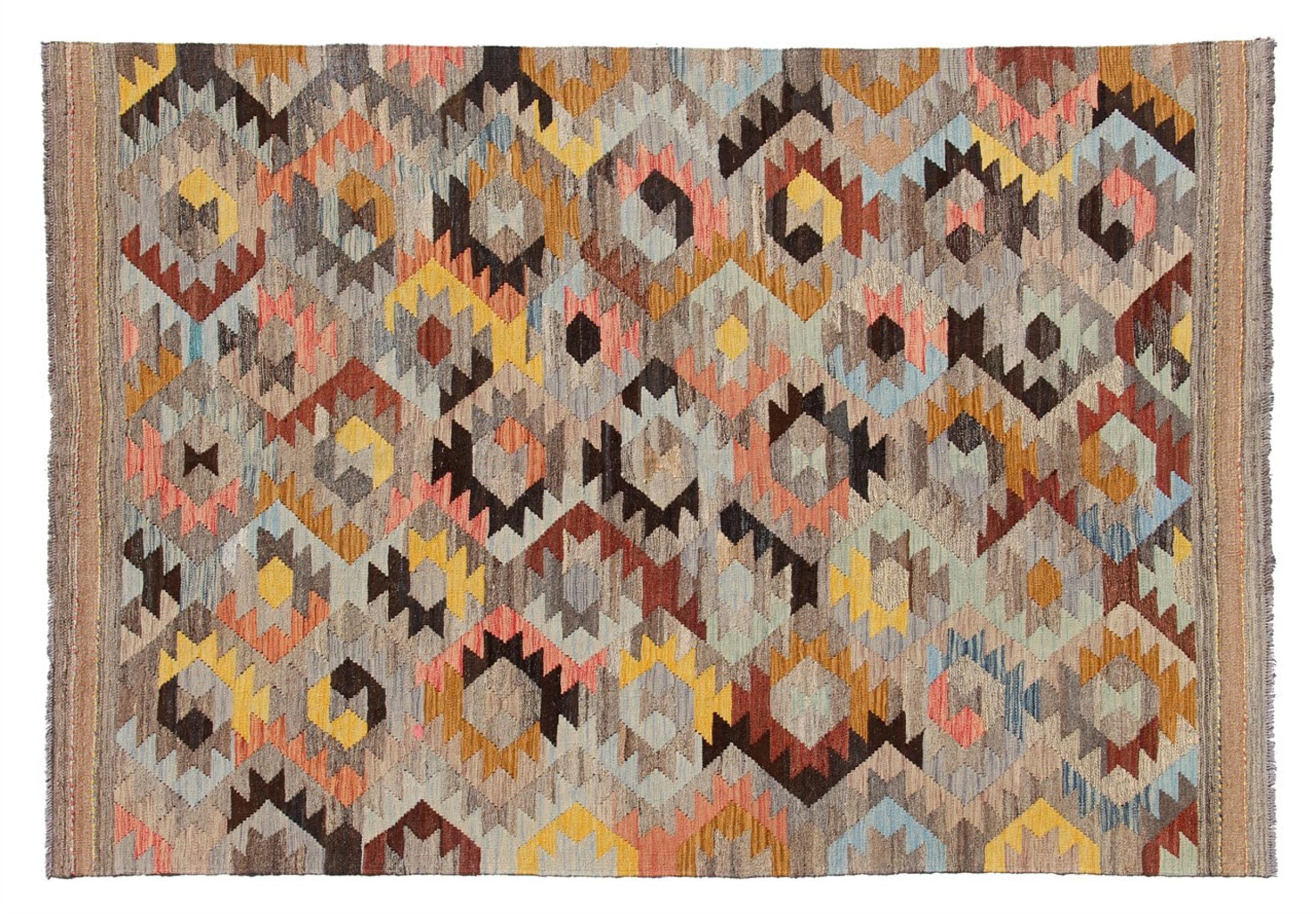 Estas alfombras kilim muestran una diferencia decisiva con las alfombras anudadas a mano - son tejidas a mano. Por lo tanto, no tienen un montón alto de lana y son a menudo más planos y más ásperos que las alfombras de lana anudada. Su fabricación es menos elaborada y por eso suelen ser mucho más baratas. Como ventaja, las alfombras de kilim son también mucho más ligeras y pueden ser colocadas por delante y por detrás. Los kilims tejidos a mano provienen originalmente de la antigua Persia y ahora también se fabrican a menudo en el Afganistán. Tienen patrones bastante simples y directos, que se deben a su técnica de tejido.