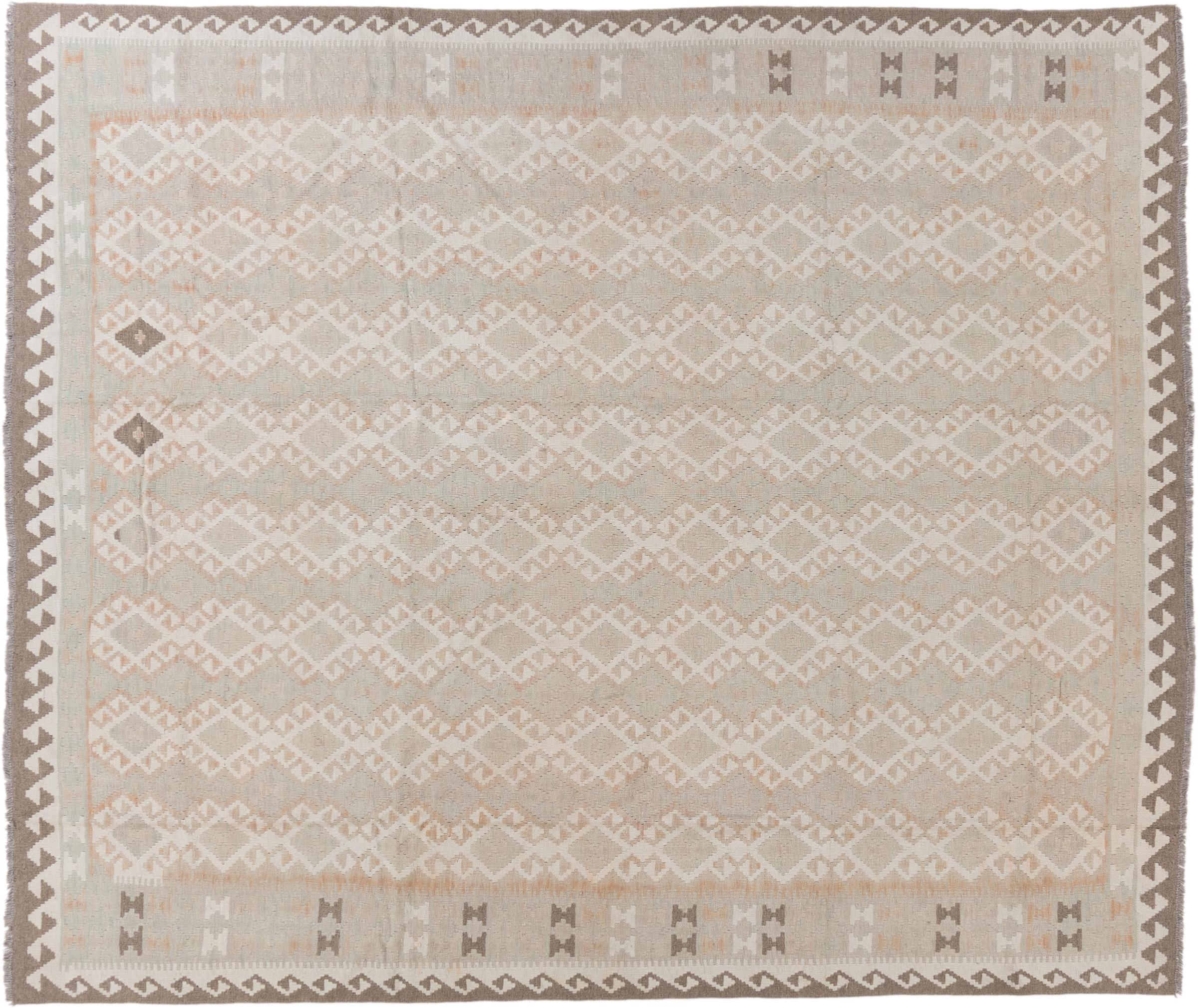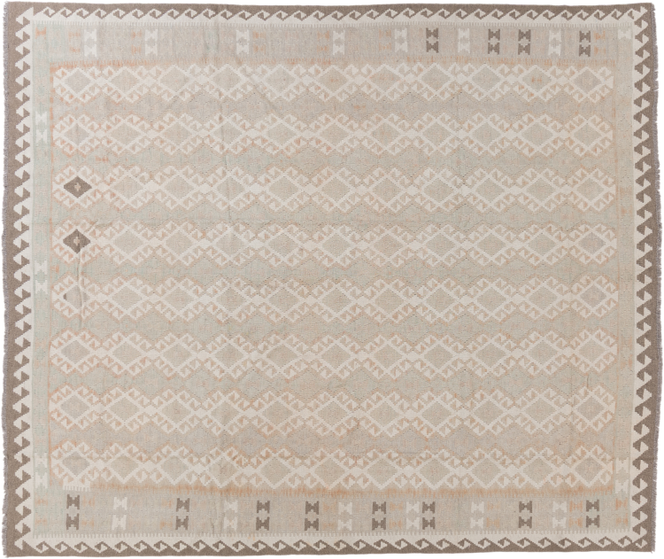 Esta alfombra fue hecha a mano en un telar como un tejido plano. Tejido plano es el término utilizado para describir las alfombras que no tienen pelo. Como el nombre promete, estas alfombras están tejidas y no anudadas. Esto resulta en una alfombra plana con una superficie estructurada. Los tejidos planos no son tan suaves y normalmente más delgados que las alfombras anudadas. Al mismo tiempo, su fabricación es mucho menos compleja y por lo general se pueden disponer por ambos lados (frontal y posterior). Sus patrones suelen ser geométricos, lo cual está determinado por el tejido.
