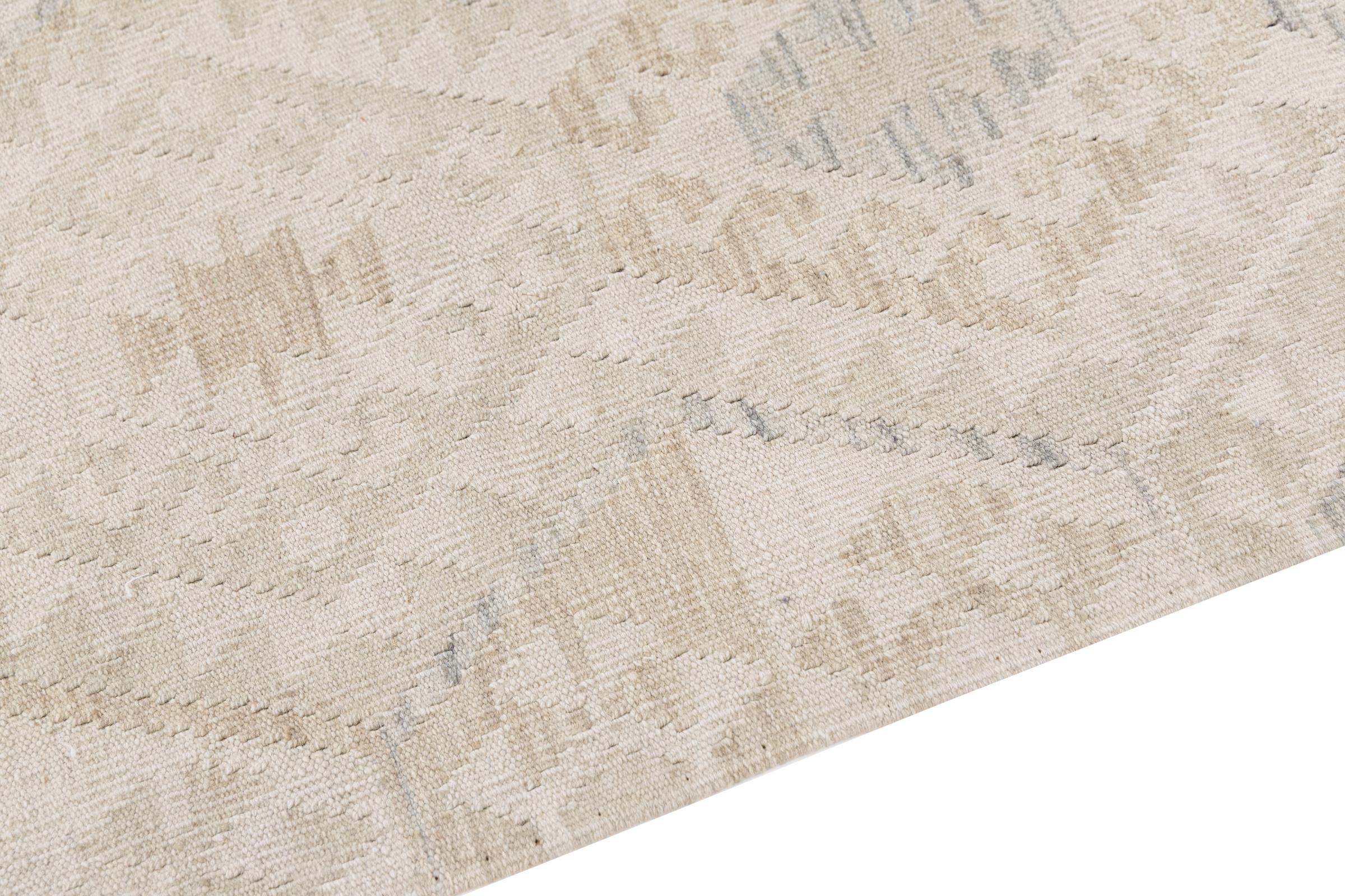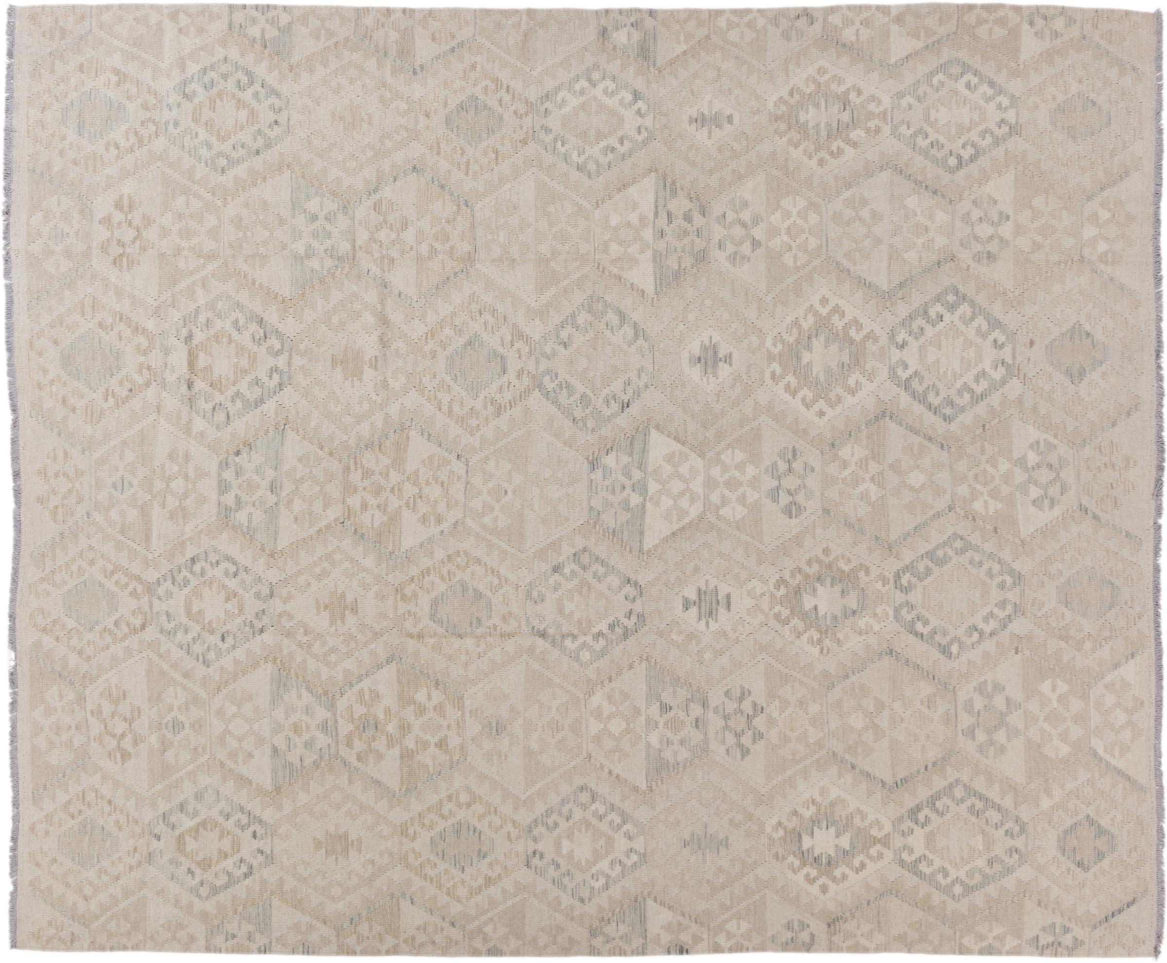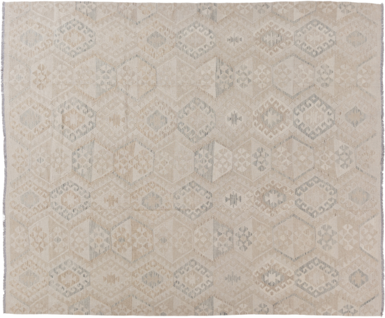 Esta alfombra fue hecha a mano en un telar como un tejido plano. Tejido plano es el término utilizado para describir las alfombras que no tienen pelo. Como el nombre promete, estas alfombras están tejidas y no anudadas. Esto resulta en una alfombra plana con una superficie estructurada. Los tejidos planos no son tan suaves y normalmente más delgados que las alfombras anudadas. Al mismo tiempo, su fabricación es mucho menos compleja y por lo general se pueden disponer por ambos lados (frontal y posterior). Sus patrones suelen ser geométricos, lo cual está determinado por el tejido.