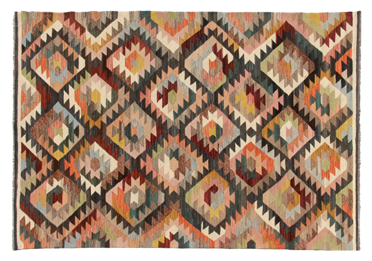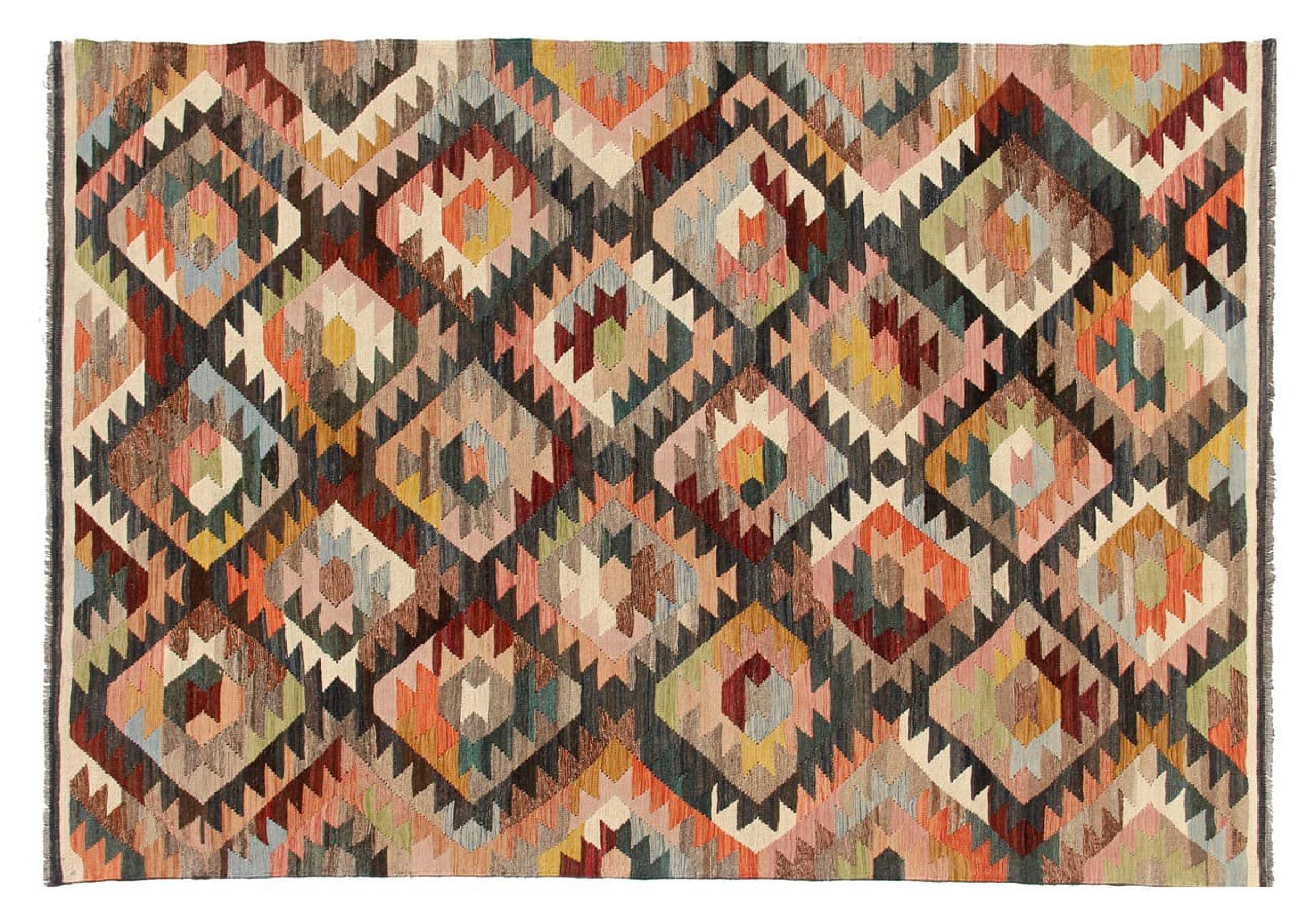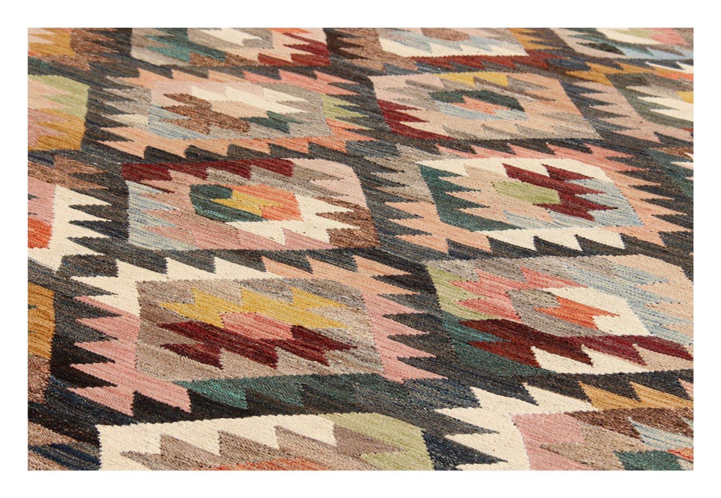 Estas alfombras kilim muestran una diferencia decisiva con las alfombras anudadas a mano - son tejidas a mano. Por lo tanto, no tienen un montón alto de lana y son a menudo más planos y más ásperos que las alfombras de lana anudada. Su fabricación es menos elaborada y por eso suelen ser mucho más baratas. Como ventaja, las alfombras de kilim son también mucho más ligeras y pueden ser colocadas por delante y por detrás. Los kilims tejidos a mano provienen originalmente de la antigua Persia y ahora también se fabrican a menudo en el Afganistán. Tienen patrones bastante simples y directos, que se deben a su técnica de tejido.