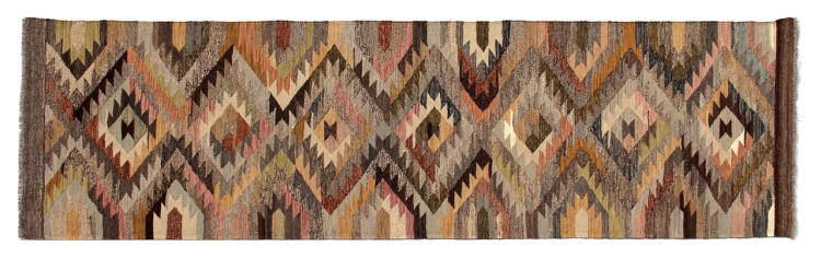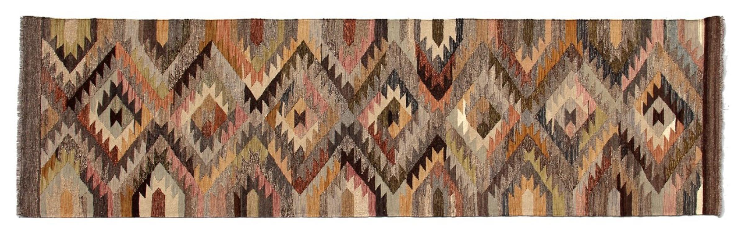 Estas alfombras kilim muestran una diferencia decisiva con las alfombras anudadas a mano - son tejidas a mano. Por lo tanto, no tienen un montón alto de lana y son a menudo más planos y más ásperos que las alfombras de lana anudada. Su fabricación es menos elaborada y por eso suelen ser mucho más baratas. Como ventaja, las alfombras de kilim son también mucho más ligeras y pueden ser colocadas por delante y por detrás. Los kilims tejidos a mano provienen originalmente de la antigua Persia y ahora también se fabrican a menudo en el Afganistán. Tienen patrones bastante simples y directos, que se deben a su técnica de tejido.