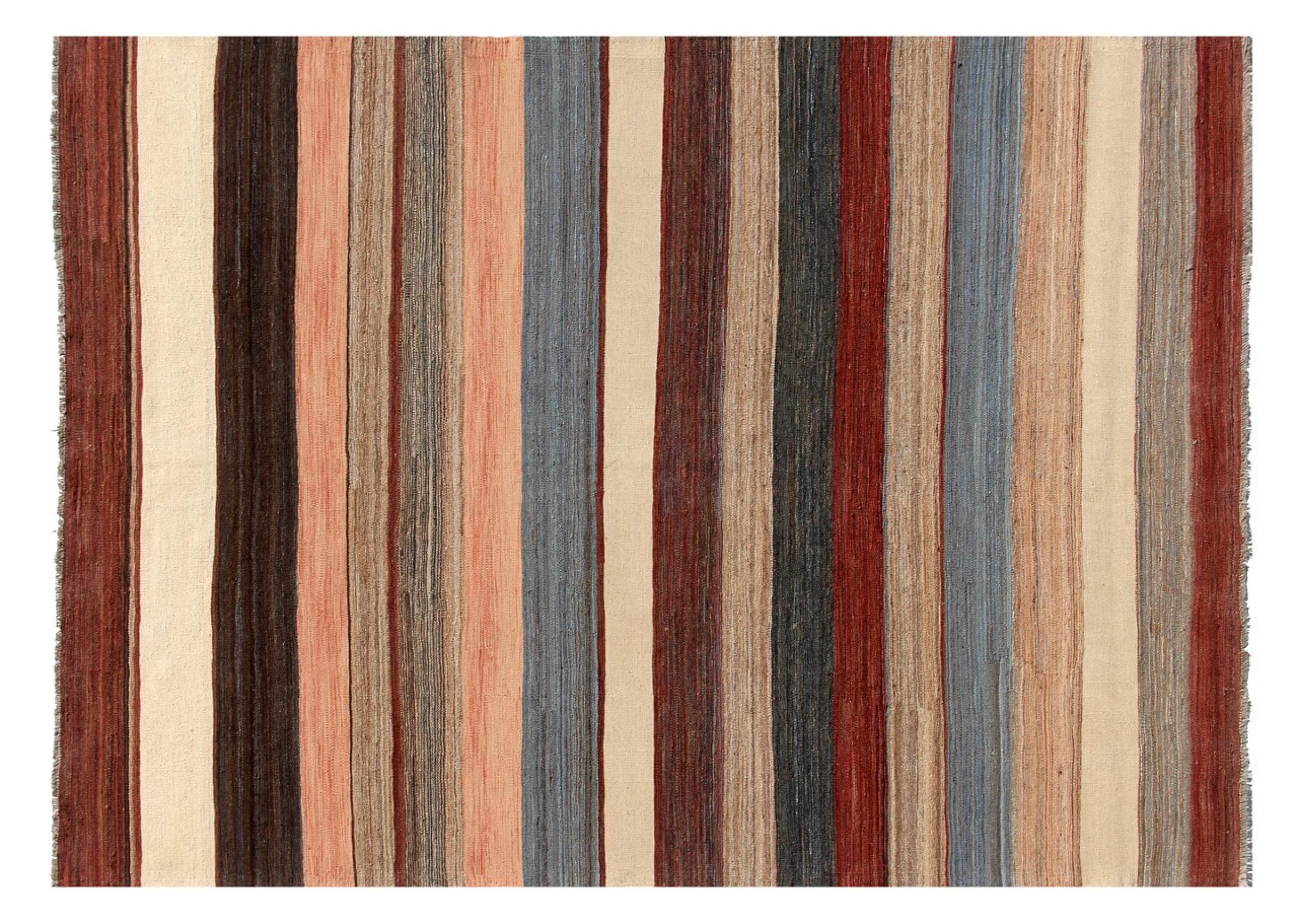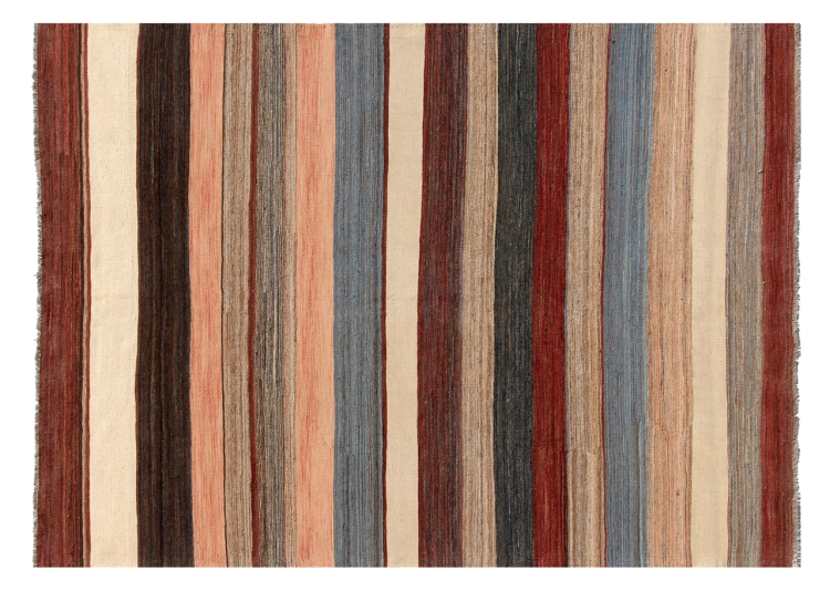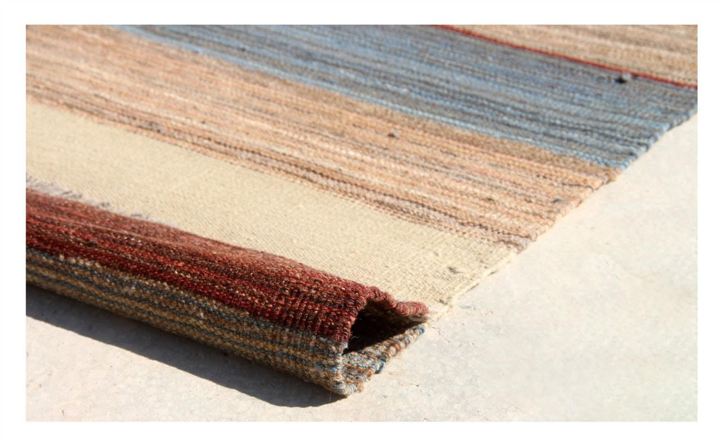 Esta alfombra fue hecha a mano en un telar como un tejido plano. Tejido plano es el término utilizado para describir las alfombras que no tienen pelo. Como el nombre promete, estas alfombras están tejidas y no anudadas. Esto resulta en una alfombra plana con una superficie estructurada. Los tejidos planos no son tan suaves y normalmente más delgados que las alfombras anudadas. Al mismo tiempo, su fabricación es mucho menos compleja y por lo general se pueden disponer por ambos lados (frontal y posterior). Sus patrones suelen ser geométricos, lo cual está determinado por el tejido.