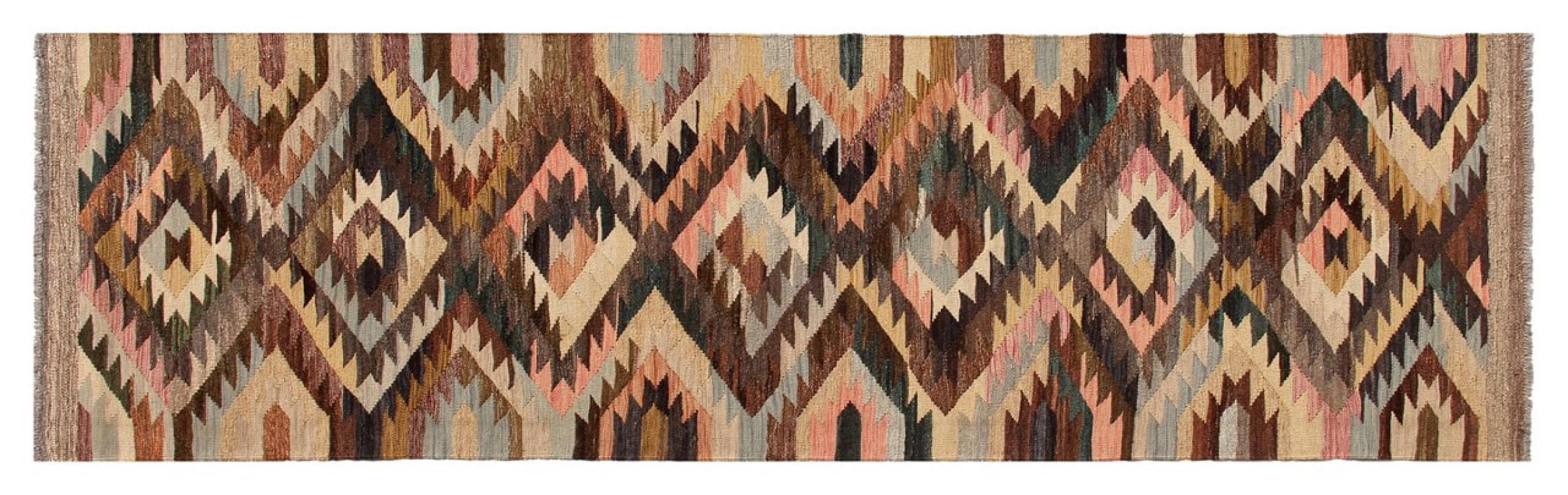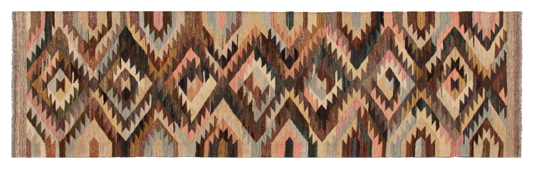 Estas alfombras kilim muestran una diferencia decisiva con las alfombras anudadas a mano - son tejidas a mano. Por lo tanto, no tienen un montón alto de lana y son a menudo más planos y más ásperos que las alfombras de lana anudada. Su fabricación es menos elaborada y por eso suelen ser mucho más baratas. Como ventaja, las alfombras de kilim son también mucho más ligeras y pueden ser colocadas por delante y por detrás. Los kilims tejidos a mano provienen originalmente de la antigua Persia y ahora también se fabrican a menudo en el Afganistán. Tienen patrones bastante simples y directos, que se deben a su técnica de tejido.