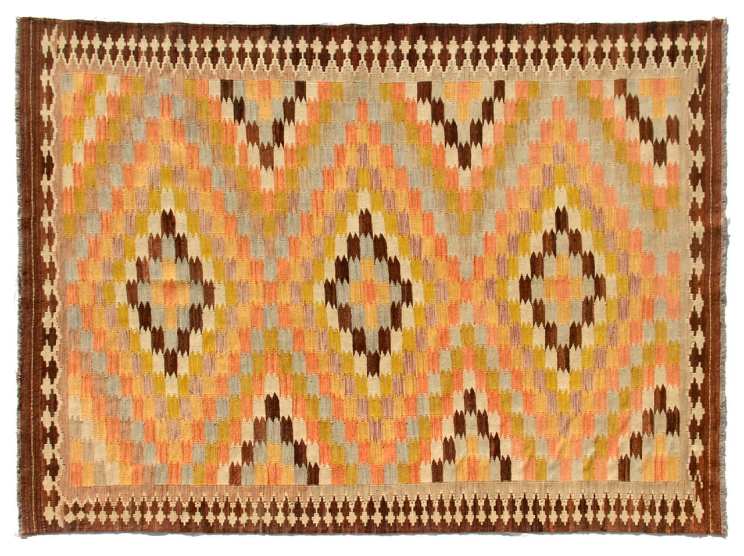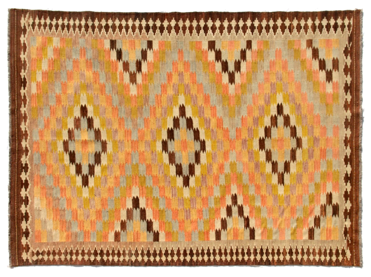 Estas alfombras kilim muestran una diferencia decisiva con las alfombras anudadas a mano - son tejidas a mano. Por lo tanto, no tienen un montón alto de lana y son a menudo más planos y más ásperos que las alfombras de lana anudada. Su fabricación es menos elaborada y por eso suelen ser mucho más baratas. Como ventaja, las alfombras de kilim son también mucho más ligeras y pueden ser colocadas por delante y por detrás. Los kilims tejidos a mano provienen originalmente de la antigua Persia y ahora también se fabrican a menudo en el Afganistán. Tienen patrones bastante simples y directos, que se deben a su técnica de tejido.