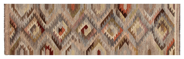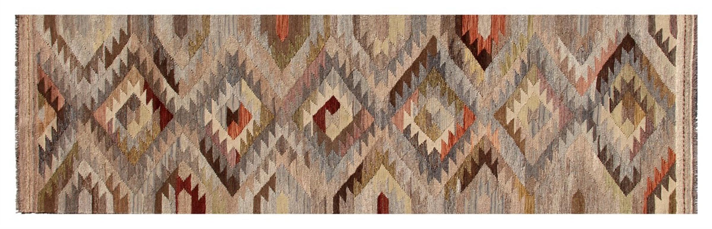 Estas alfombras kilim muestran una diferencia decisiva con las alfombras anudadas a mano - son tejidas a mano. Por lo tanto, no tienen un montón alto de lana y son a menudo más planos y más ásperos que las alfombras de lana anudada. Su fabricación es menos elaborada y por eso suelen ser mucho más baratas. Como ventaja, las alfombras de kilim son también mucho más ligeras y pueden ser colocadas por delante y por detrás. Los kilims tejidos a mano provienen originalmente de la antigua Persia y ahora también se fabrican a menudo en el Afganistán. Tienen patrones bastante simples y directos, que se deben a su técnica de tejido.