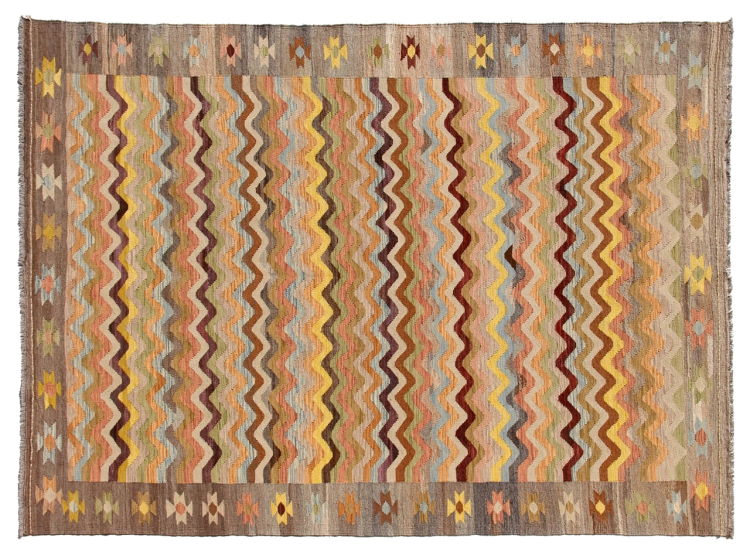 Esta alfombra fue hecha a mano en un telar como un tejido plano. Tejido plano es el término utilizado para describir las alfombras que no tienen pelo. Como el nombre promete, estas alfombras están tejidas y no anudadas. Esto resulta en una alfombra plana con una superficie estructurada. Los tejidos planos no son tan suaves y normalmente más delgados que las alfombras anudadas. Al mismo tiempo, su fabricación es mucho menos compleja y por lo general se pueden disponer por ambos lados (frontal y posterior). Sus patrones suelen ser geométricos, lo cual está determinado por el tejido.
