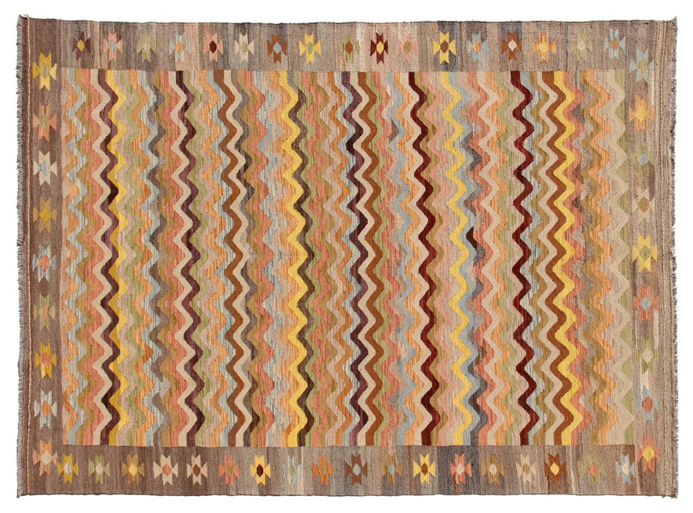 Estas alfombras kilim muestran una diferencia decisiva con las alfombras anudadas a mano - son tejidas a mano. Por lo tanto, no tienen un montón alto de lana y son a menudo más planos y más ásperos que las alfombras de lana anudada. Su fabricación es menos elaborada y por eso suelen ser mucho más baratas. Como ventaja, las alfombras de kilim son también mucho más ligeras y pueden ser colocadas por delante y por detrás. Los kilims tejidos a mano provienen originalmente de la antigua Persia y ahora también se fabrican a menudo en el Afganistán. Tienen patrones bastante simples y directos, que se deben a su técnica de tejido.