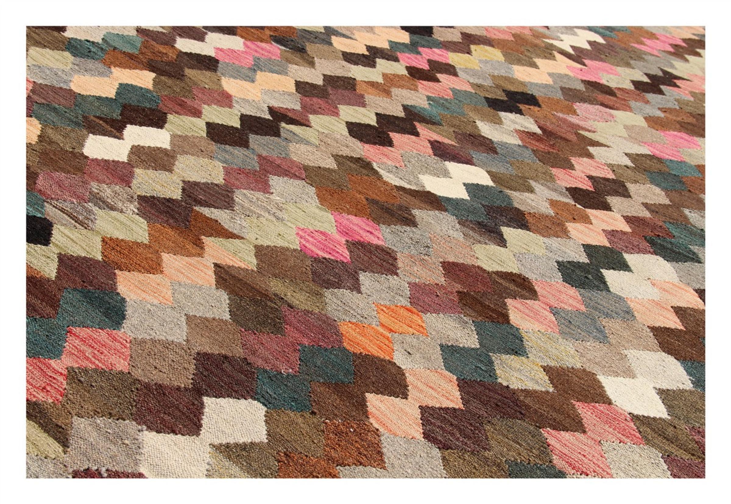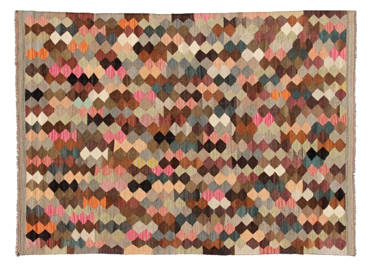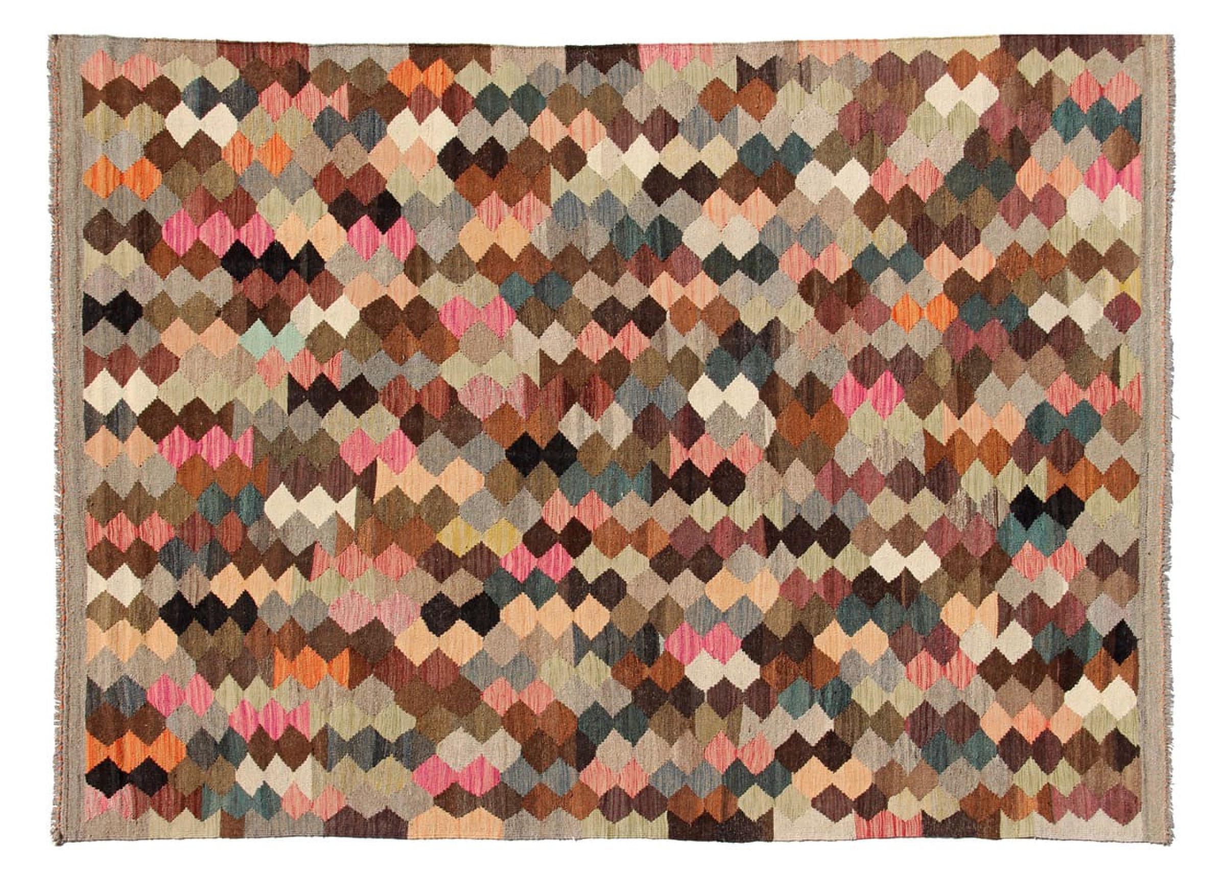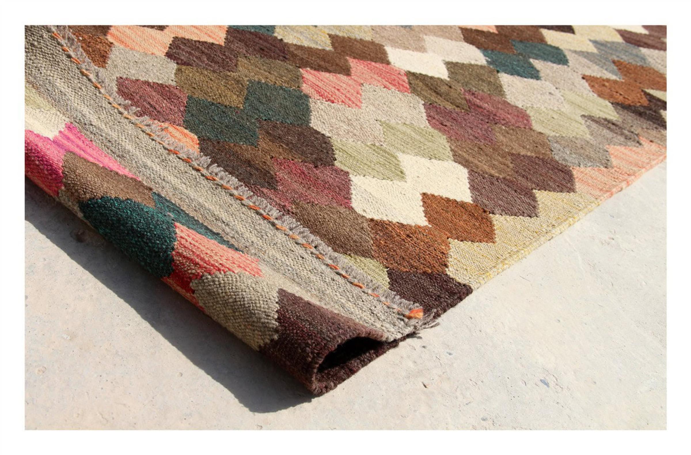 Estas alfombras kilim muestran una diferencia decisiva con las alfombras anudadas a mano - son tejidas a mano. Por lo tanto, no tienen un montón alto de lana y son a menudo más planos y más ásperos que las alfombras de lana anudada. Su fabricación es menos elaborada y por eso suelen ser mucho más baratas. Como ventaja, las alfombras de kilim son también mucho más ligeras y pueden ser colocadas por delante y por detrás. Los kilims tejidos a mano provienen originalmente de la antigua Persia y ahora también se fabrican a menudo en el Afganistán. Tienen patrones bastante simples y directos, que se deben a su técnica de tejido.