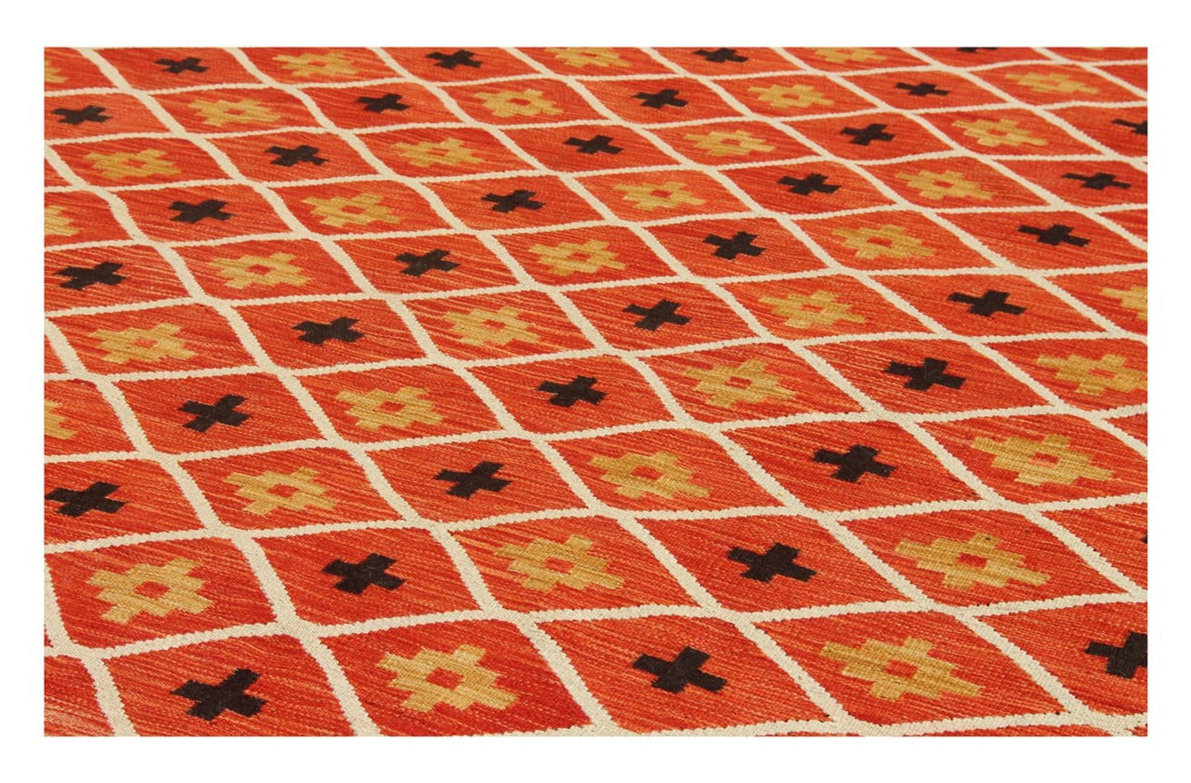 Esta alfombra fue hecha a mano en un telar como un tejido plano. Tejido plano es el término utilizado para describir las alfombras que no tienen pelo. Como el nombre promete, estas alfombras están tejidas y no anudadas. Esto resulta en una alfombra plana con una superficie estructurada. Los tejidos planos no son tan suaves y normalmente más delgados que las alfombras anudadas. Al mismo tiempo, su fabricación es mucho menos compleja y por lo general se pueden disponer por ambos lados (frontal y posterior). Sus patrones suelen ser geométricos, lo cual está determinado por el tejido.