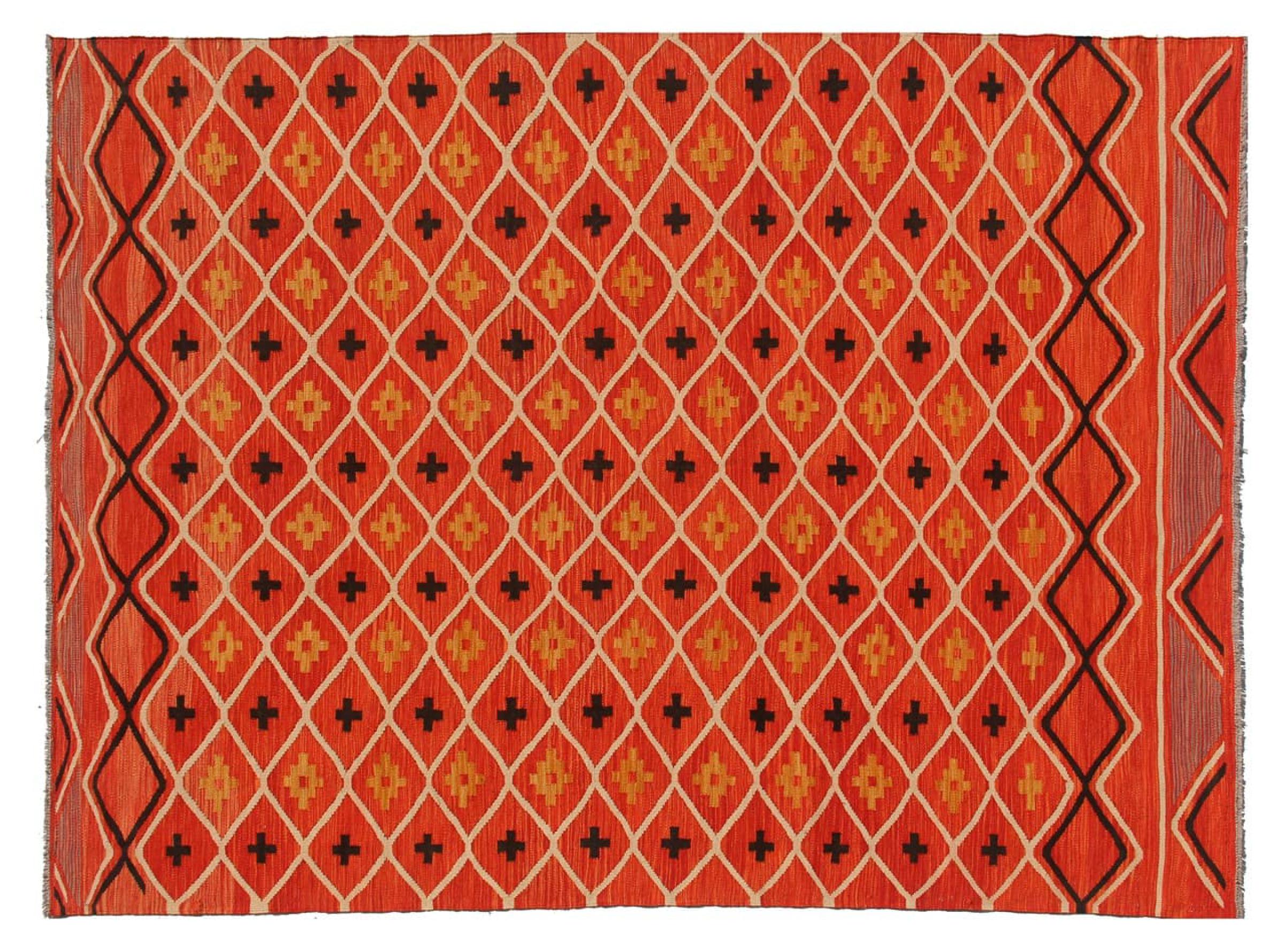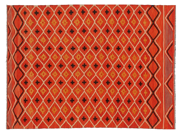 Estas alfombras kilim muestran una diferencia decisiva con las alfombras anudadas a mano - son tejidas a mano. Por lo tanto, no tienen un montón alto de lana y son a menudo más planos y más ásperos que las alfombras de lana anudada. Su fabricación es menos elaborada y por eso suelen ser mucho más baratas. Como ventaja, las alfombras de kilim son también mucho más ligeras y pueden ser colocadas por delante y por detrás. Los kilims tejidos a mano provienen originalmente de la antigua Persia y ahora también se fabrican a menudo en el Afganistán. Tienen patrones bastante simples y directos, que se deben a su técnica de tejido.