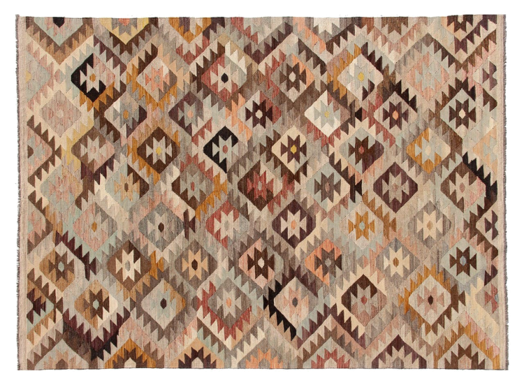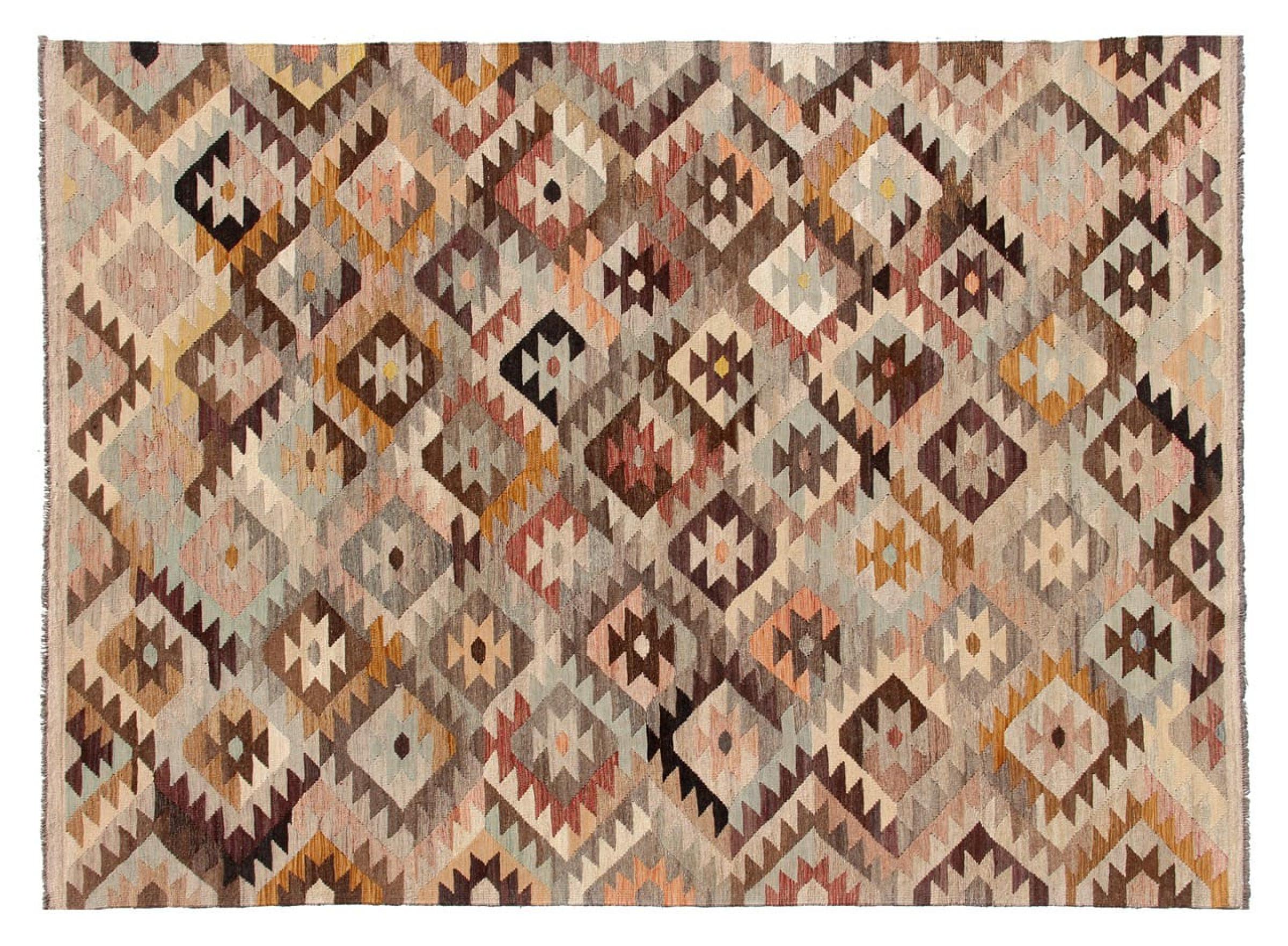 Estas alfombras kilim muestran una diferencia decisiva con las alfombras anudadas a mano - son tejidas a mano. Por lo tanto, no tienen un montón alto de lana y son a menudo más planos y más ásperos que las alfombras de lana anudada. Su fabricación es menos elaborada y por eso suelen ser mucho más baratas. Como ventaja, las alfombras de kilim son también mucho más ligeras y pueden ser colocadas por delante y por detrás. Los kilims tejidos a mano provienen originalmente de la antigua Persia y ahora también se fabrican a menudo en el Afganistán. Tienen patrones bastante simples y directos, que se deben a su técnica de tejido.