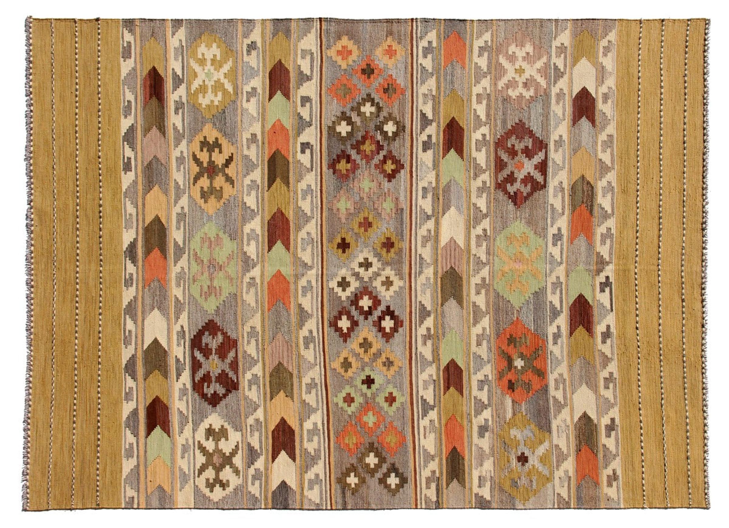 Esta alfombra fue hecha a mano en un telar como un tejido plano. Tejido plano es el término utilizado para describir las alfombras que no tienen pelo. Como el nombre promete, estas alfombras están tejidas y no anudadas. Esto resulta en una alfombra plana con una superficie estructurada. Los tejidos planos no son tan suaves y normalmente más delgados que las alfombras anudadas. Al mismo tiempo, su fabricación es mucho menos compleja y por lo general se pueden disponer por ambos lados (frontal y posterior). Sus patrones suelen ser geométricos, lo cual está determinado por el tejido.