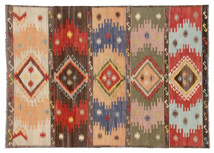 Esta alfombra fue hecha a mano en un telar como un tejido plano. Tejido plano es el término utilizado para describir las alfombras que no tienen pelo. Como el nombre promete, estas alfombras están tejidas y no anudadas. Esto resulta en una alfombra plana con una superficie estructurada. Los tejidos planos no son tan suaves y normalmente más delgados que las alfombras anudadas. Al mismo tiempo, su fabricación es mucho menos compleja y por lo general se pueden disponer por ambos lados (frontal y posterior). Sus patrones suelen ser geométricos, lo cual está determinado por el tejido.