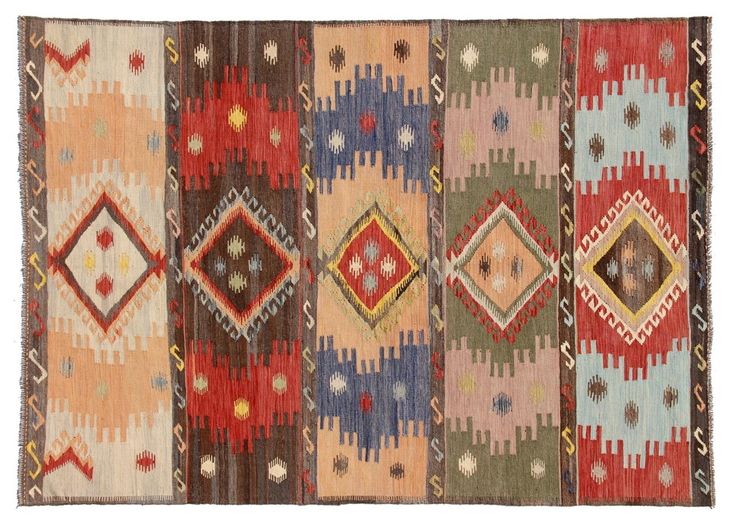 Estas alfombras kilim muestran una diferencia decisiva con las alfombras anudadas a mano - son tejidas a mano. Por lo tanto, no tienen un montón alto de lana y son a menudo más planos y más ásperos que las alfombras de lana anudada. Su fabricación es menos elaborada y por eso suelen ser mucho más baratas. Como ventaja, las alfombras de kilim son también mucho más ligeras y pueden ser colocadas por delante y por detrás. Los kilims tejidos a mano provienen originalmente de la antigua Persia y ahora también se fabrican a menudo en el Afganistán. Tienen patrones bastante simples y directos, que se deben a su técnica de tejido.
