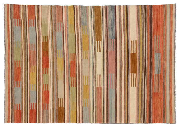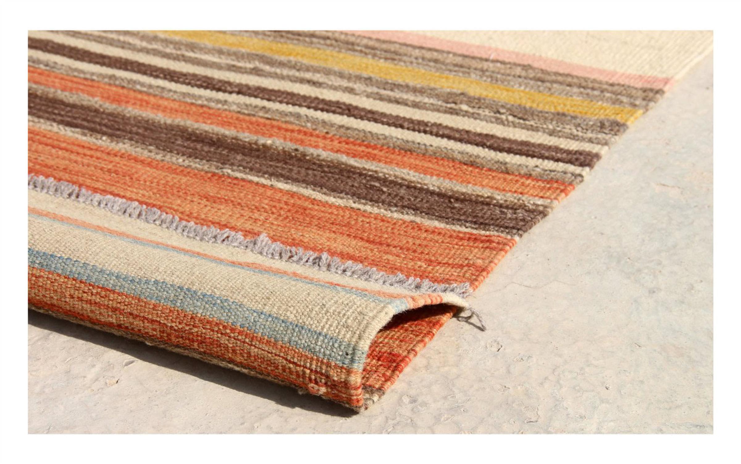 Esta alfombra fue hecha a mano en un telar como un tejido plano. Tejido plano es el término utilizado para describir las alfombras que no tienen pelo. Como el nombre promete, estas alfombras están tejidas y no anudadas. Esto resulta en una alfombra plana con una superficie estructurada. Los tejidos planos no son tan suaves y normalmente más delgados que las alfombras anudadas. Al mismo tiempo, su fabricación es mucho menos compleja y por lo general se pueden disponer por ambos lados (frontal y posterior). Sus patrones suelen ser geométricos, lo cual está determinado por el tejido.