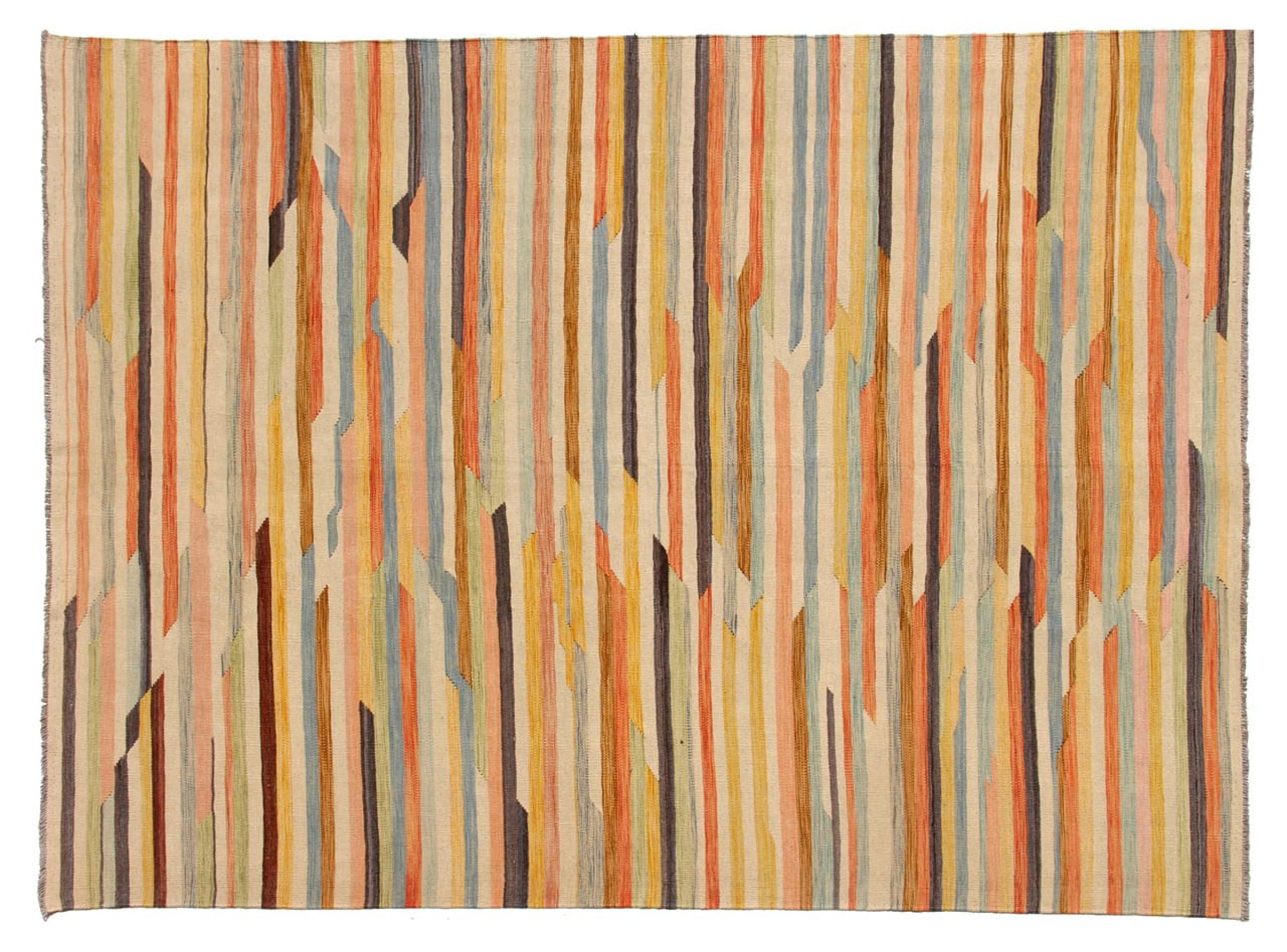 Esta alfombra fue hecha a mano en un telar como un tejido plano. Tejido plano es el término utilizado para describir las alfombras que no tienen pelo. Como el nombre promete, estas alfombras están tejidas y no anudadas. Esto resulta en una alfombra plana con una superficie estructurada. Los tejidos planos no son tan suaves y normalmente más delgados que las alfombras anudadas. Al mismo tiempo, su fabricación es mucho menos compleja y por lo general se pueden disponer por ambos lados (frontal y posterior). Sus patrones suelen ser geométricos, lo cual está determinado por el tejido.